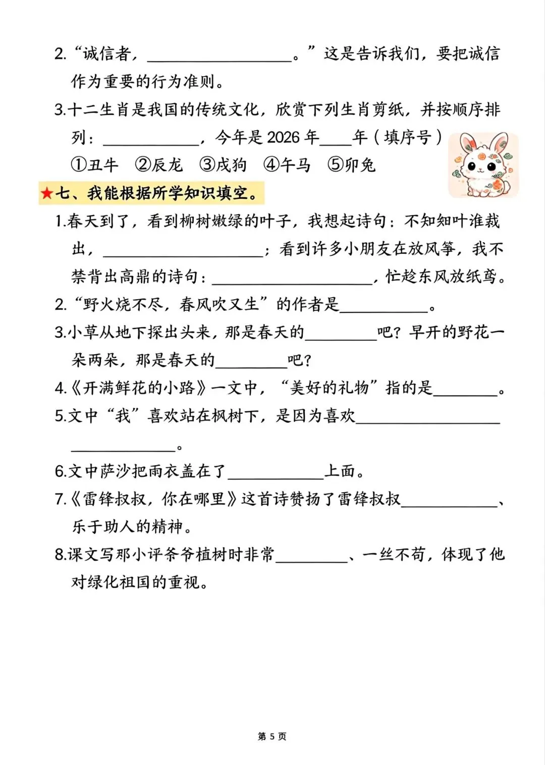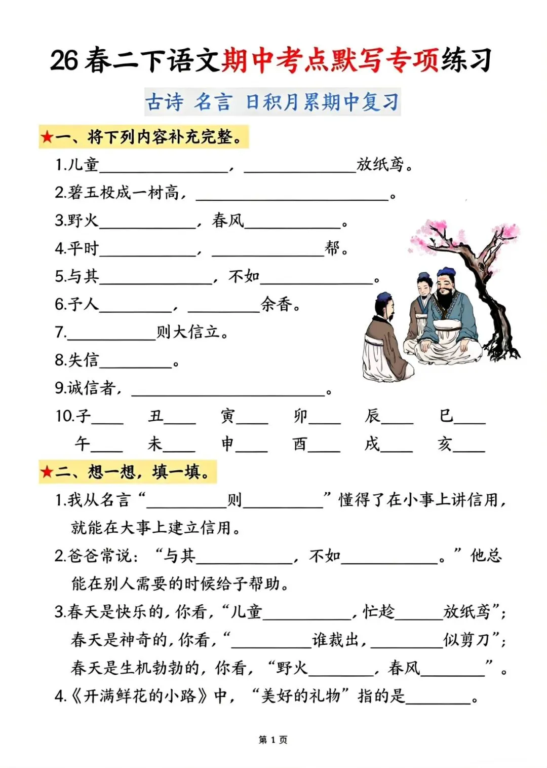 二下语文期中考点默写专项练习|完整版电子版可免费下载打印