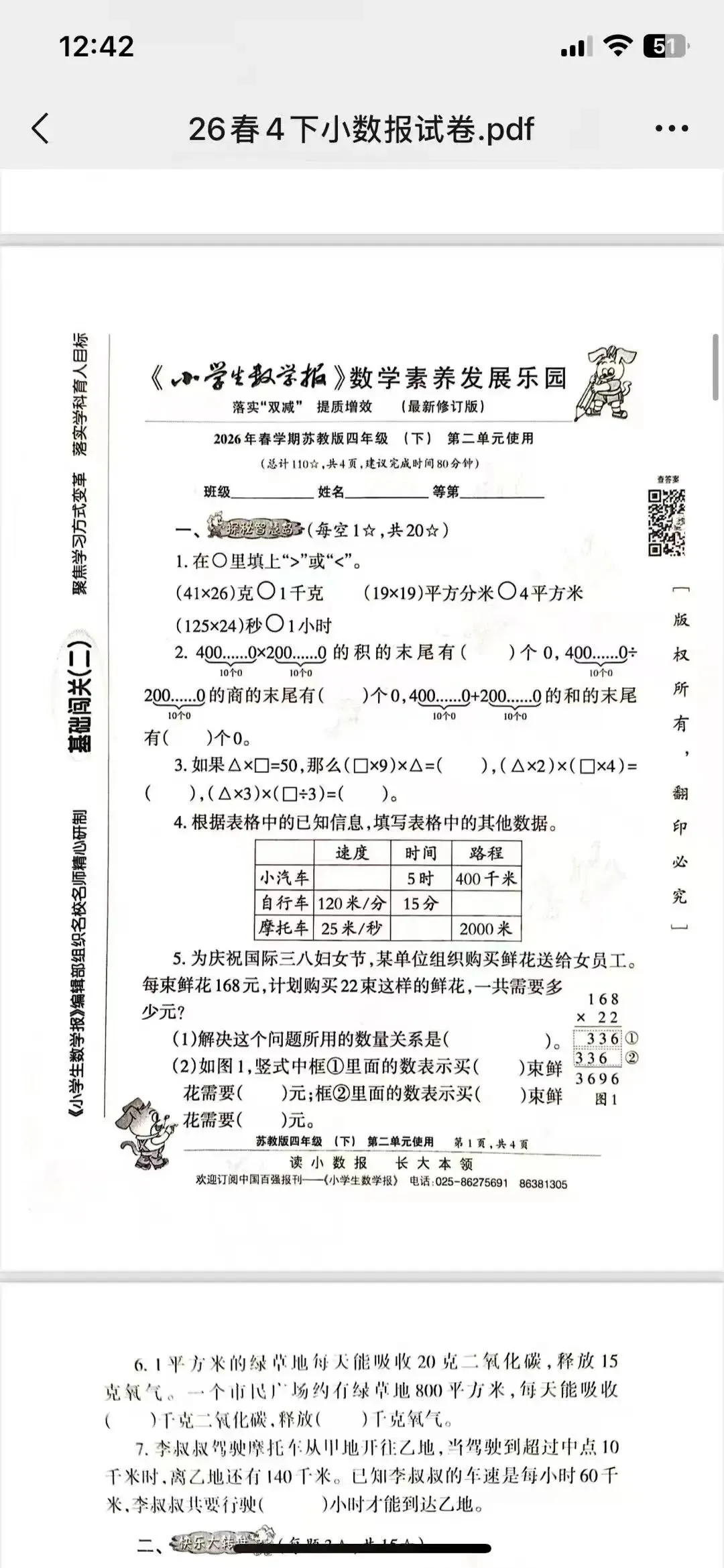 苏教版小学生数学报26春一至六年级下册,电子版打印