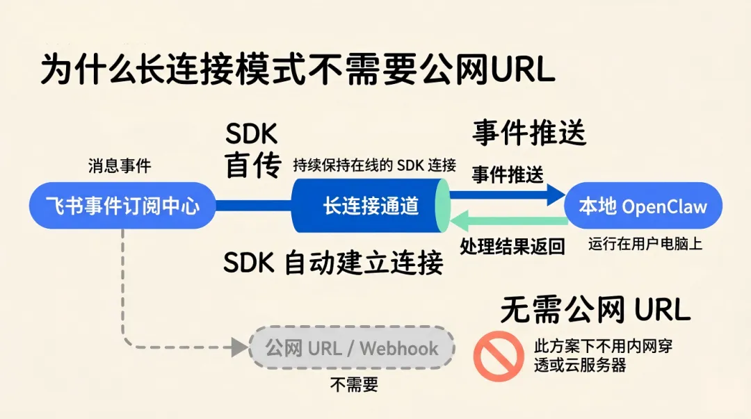 飞书支持长连接方式接收事件,不需要配置公网 URL,适合本地开发和个人使用。