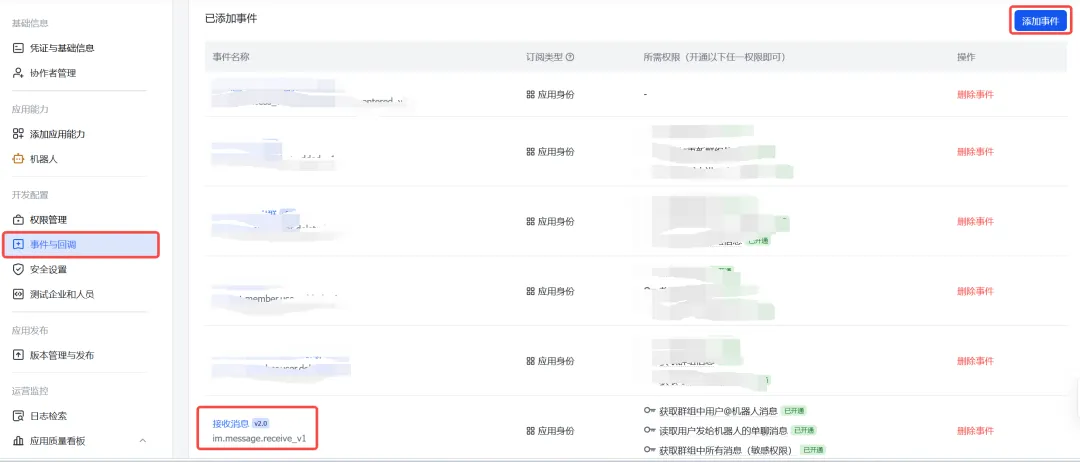 配置好长连接后,需要告诉飞书你要接收哪些类型的事件。