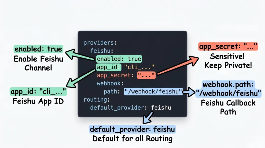 # OpenClaw 主配置providers: feishu: enabled: true app_id: "cli_你的AppID" app_secret: "你的AppSecret"# 路由配置(可选)routing: default_provider: feishu