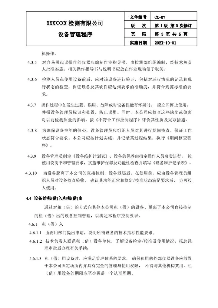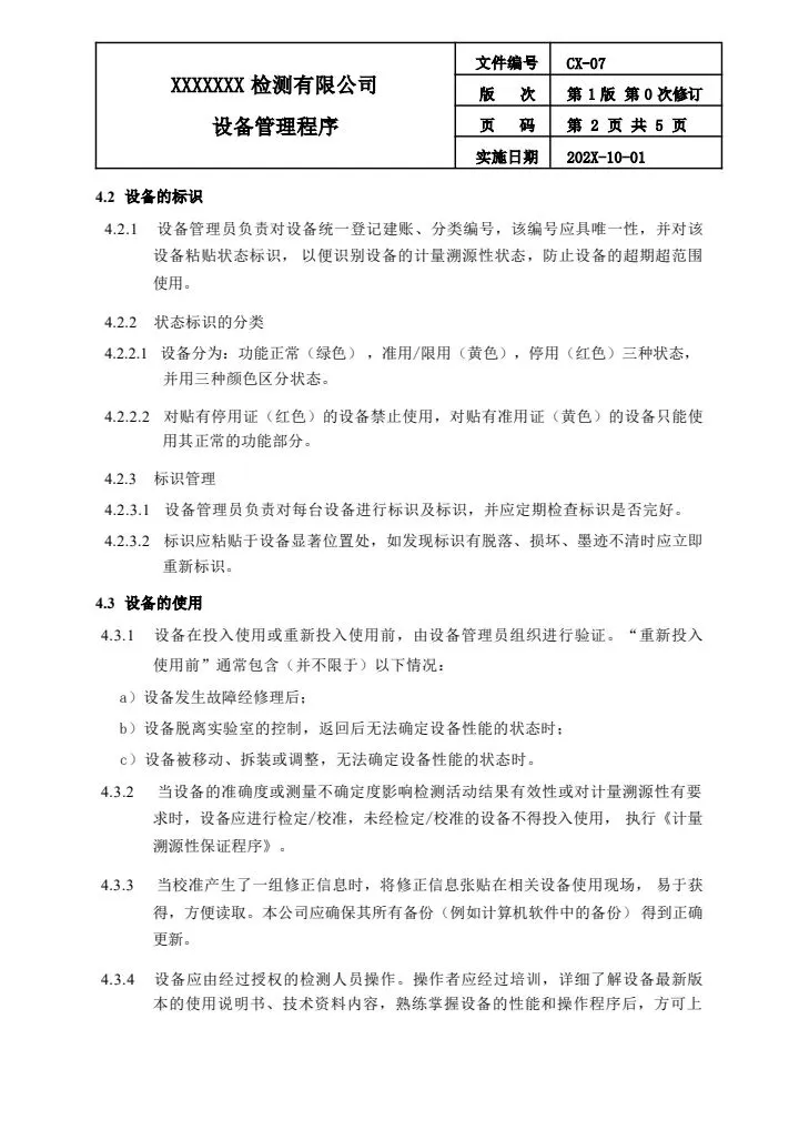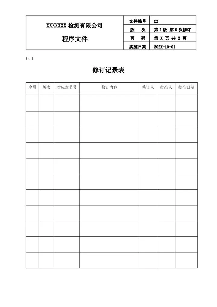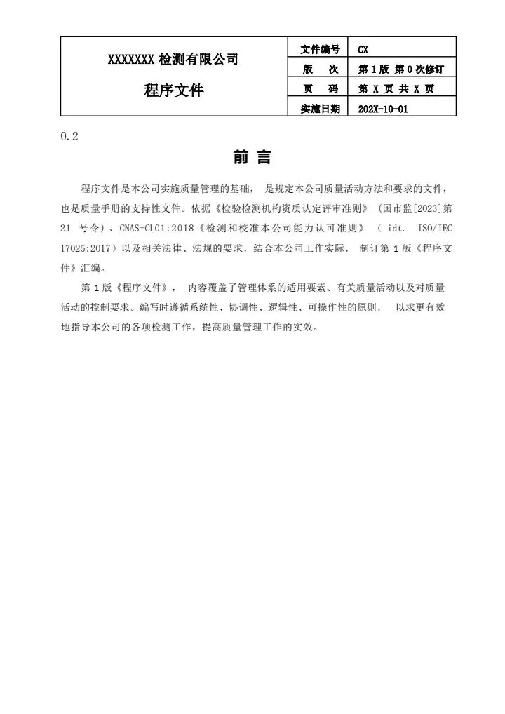 第 1 版《程序文件》, 内容覆盖了管理体系的适用要素、有关质量活动以及对质量活动的控制要求。编写时遵循系统性、协调性、逻辑性、可操作性的原则, 以求更有效地指导本公司的各项检测工作,提高质量管理工作的实效。