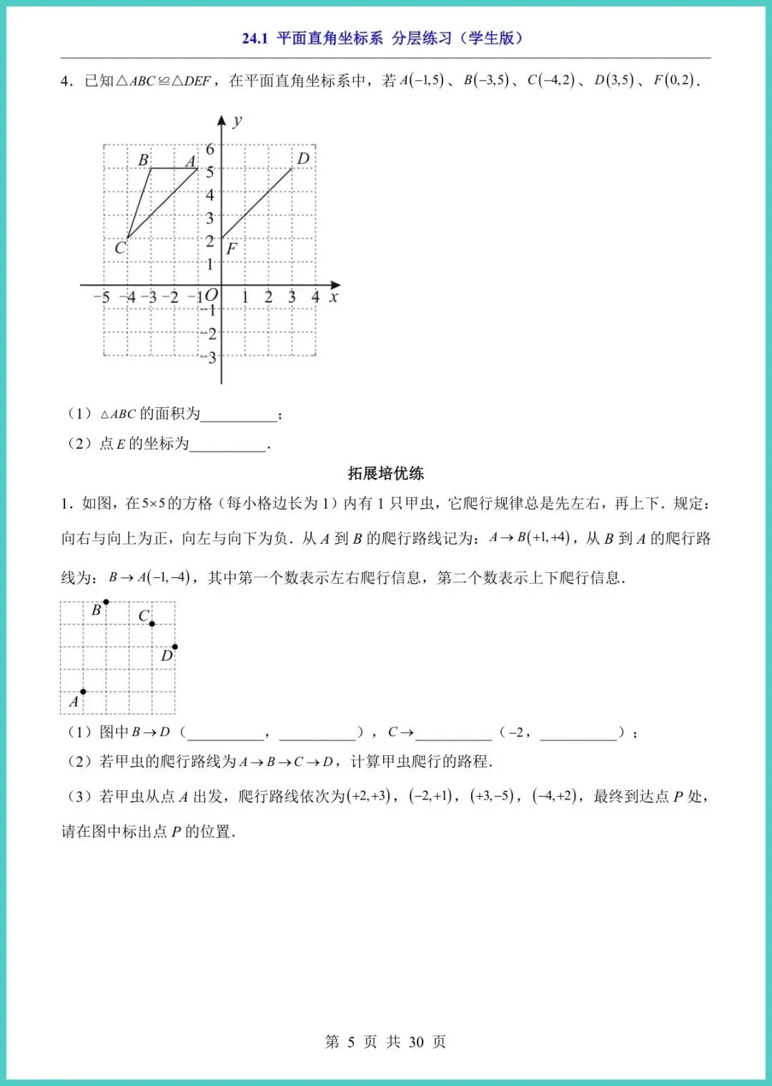 25春沪教54版八年级下册数学《24.1平面直角坐标系·分层练习》,30页精编电子版新鲜出炉!资料把“点的坐标、象限判断、距离公式、几何作图”拆成基础、进阶、拓展三层,每一层都配典型例题变式训练易错提醒,让孩子先稳再拔高,画图不跑偏,计算零失误。附赠答案详解,扫码还能看动图演示,坐公交也能秒懂坐标平移。期末想冲满分,现在就差这一套!需要的家长赶紧打印,今晚就让孩子练起来!