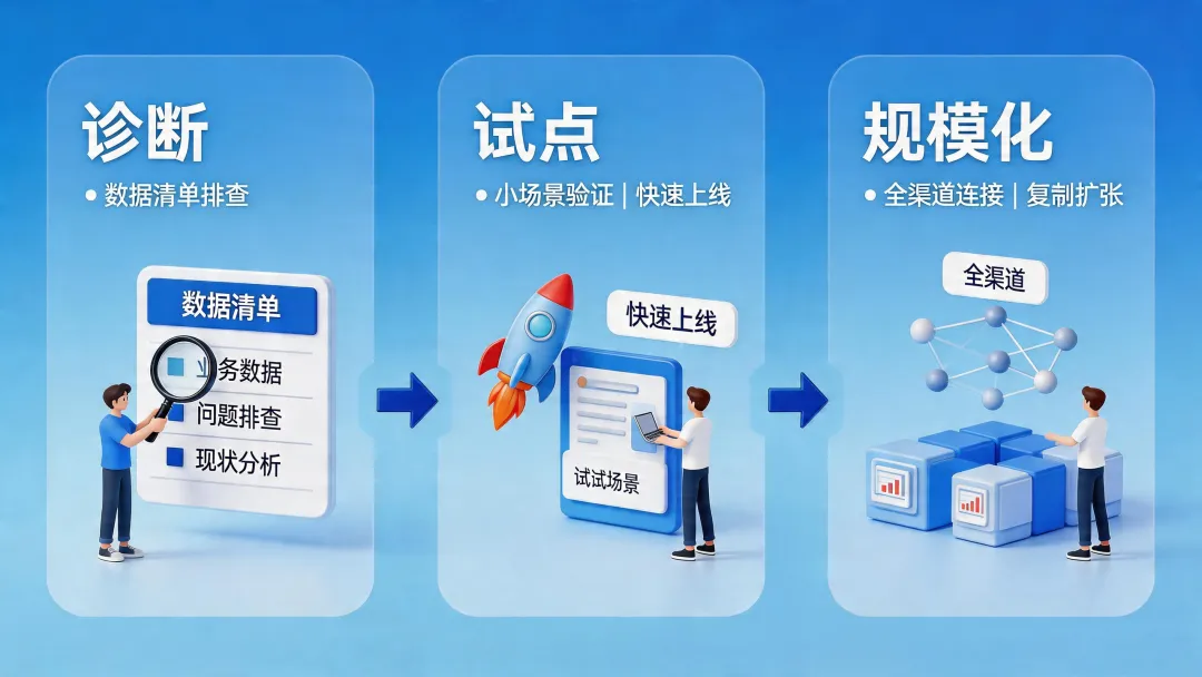 将试点成熟的模型、流程、方案批量复制;打通电话、APP、公众号、网页、线下终端等全渠道;形成AI处理基础工作、人工解决复杂问题的人机协同闭环;通过数据看板持续监控,让AI自学习迭代,长期提升ROI。