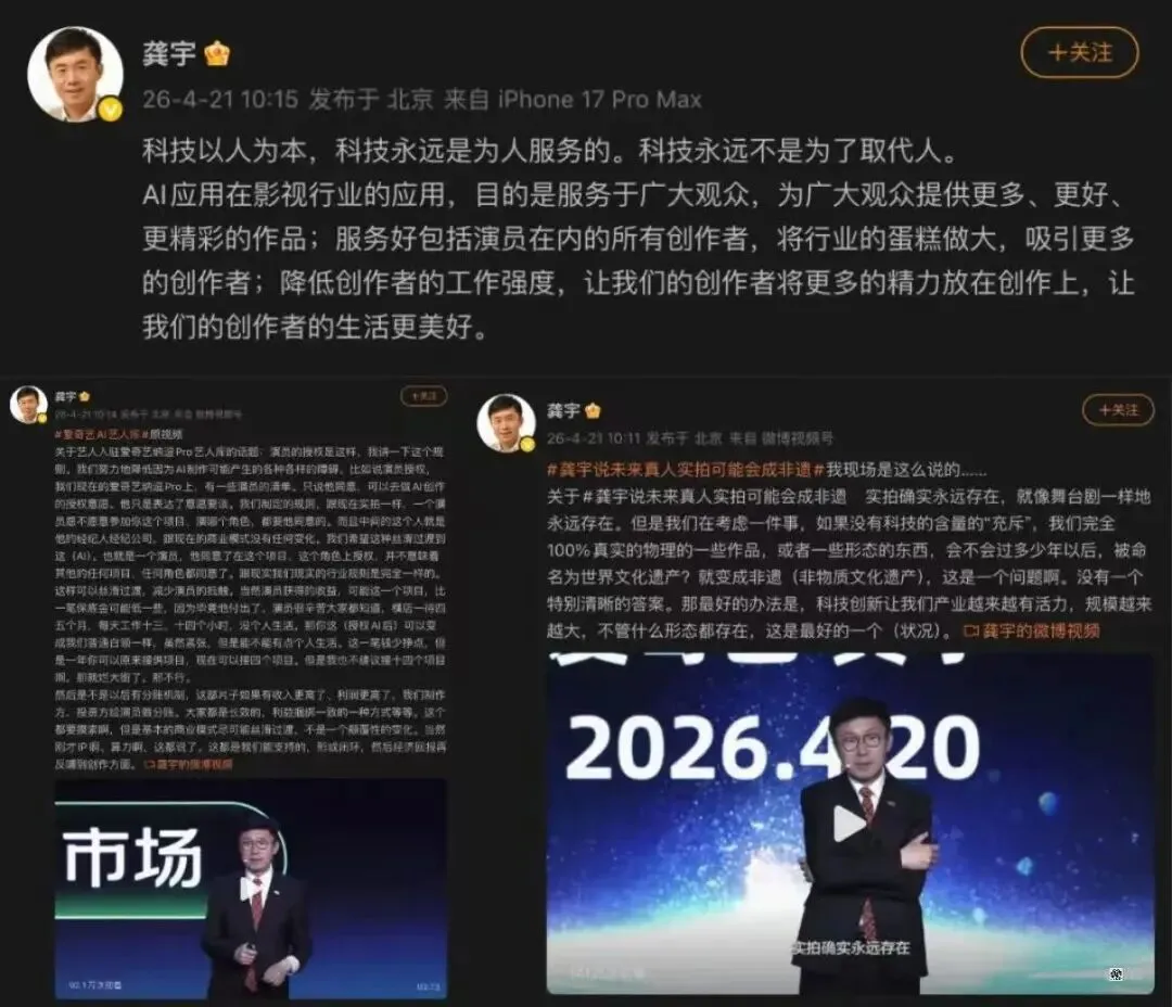 当 “超百位艺人入驻纳逗 Pro AI 艺人库” 的消息传出,一份包含张若昀、于和伟等知名演员的名单在网络发酵,随即迎来多位艺人的辟谣回应 —— 张若昀工作室明确表示未签署任何 AI 相关授权,面对愈演愈烈的争议,爱奇艺 CEO 龚宇在 4 月 21 日连发三条微博,针对核心质疑逐一澄清。他首先明确了 AI 艺人库的核心逻辑:艺人入库仅代表有接洽 AI 影视项目的意愿,具体参与哪个项目、出演哪个角色,都需要单独商谈和授权,这一流程与传统真人影视合作完全一致,“跟现在的商业模式没有任何变化”。针对网传未经艺人同意入库的说法,龚宇强调不存在此类情况,部分被误传的艺人并未出现在入库名单中,新浪娱乐也随后发布更正说明印证了这一点。