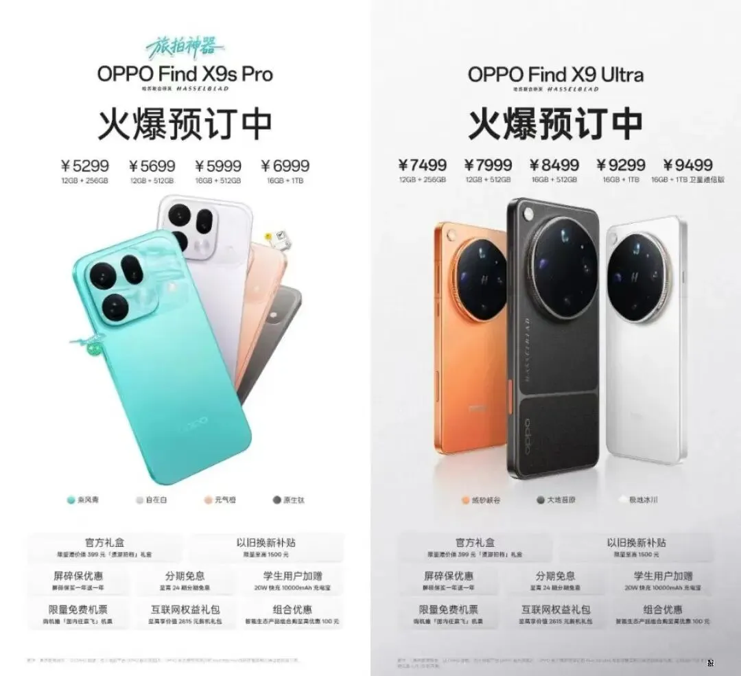 OPPO 正式举办哈苏影像新品发布会,一口气推出 Find X9 Ultra、Find X9s Pro 两款旗舰手机,以及多款平板、智能穿戴新品,在影像、续航与性能维度带来全面升级。Find X9 Ultra 搭载第五代骁龙 8 至尊版处理器,起售价 7499 元,顶配 16GB+1TB 卫星通信版售价 9499 元,包含同款卫星通信版及全套影像配件的哈苏大地探索家大师套装定价 11999 元。主打小屏长续航的 Find X9s Pro,起售价 5299 元,与前代保持一致。它采用联发科天玑 9500 平台,6.32 英寸直屏设计,机身厚度 8.4mm、重量仅 198g,单手握持毫无压力。影像方面同样搭载 2 亿像素主摄,搭配 2 亿像素潜望长焦与 5000 万像素超广角,7025mAh 大容量电池解决了小屏手机续航短板,同时配备四款清新配色。