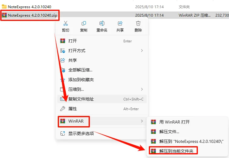 关注学术破壁机,添加学术顾问,即可获取软件安装包。选中下载的压缩包,然后鼠标右键选择“解压到当前文件夹”