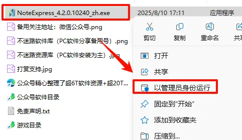 打开刚刚解压的文件夹,鼠标右键点击“NoteExpress_4.2.0.10240_zh.exe”选择“以管理员身份运行”