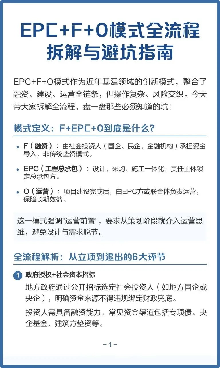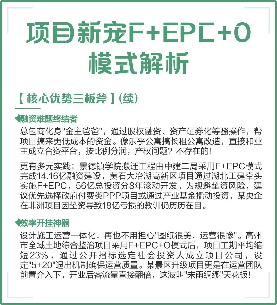 “C+EPC+F+O”是一种集成化的项目投融资与实施模式,广泛应用于地方政府推动产业项目、基础设施和综合开发中的全流程运作