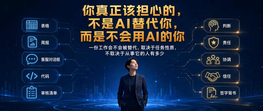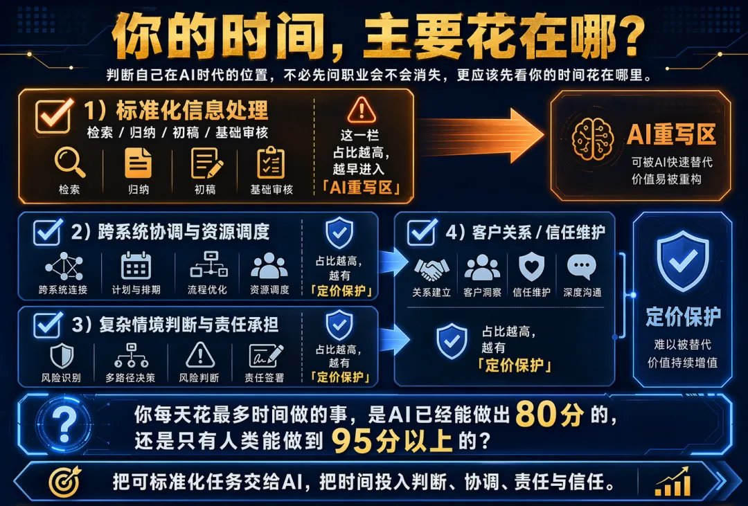 📌 图注:判断自己在AI时代的位置,不必先问职业会不会消失,更应该先看:你的时间,主要花在标准化任务上,还是花在判断、协调、责任与信任上。