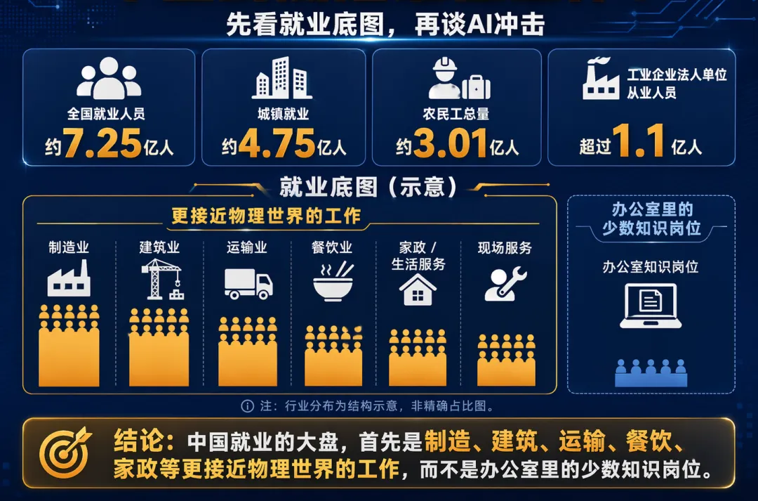 📌 图注:中国就业的大盘,首先是制造、建筑、运输、餐饮、家政等更接近物理世界的岗位,而不是办公室里的少数知识岗位。讨论AI冲击就业,不能只盯着白领工作。