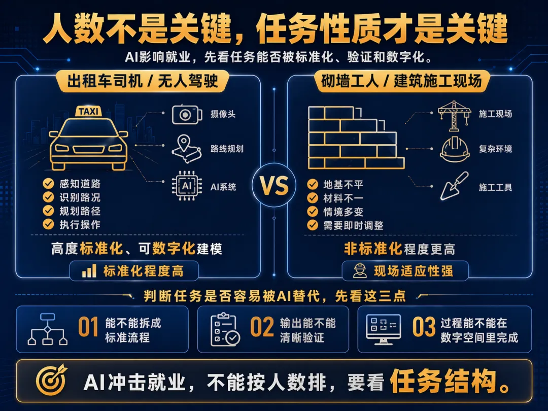 📌 图注:一份工作会不会被AI改写,关键不在人数多少,而在于任务是否标准化、是否可验证、是否可在数字空间内完成。人数很多,不代表就安全。