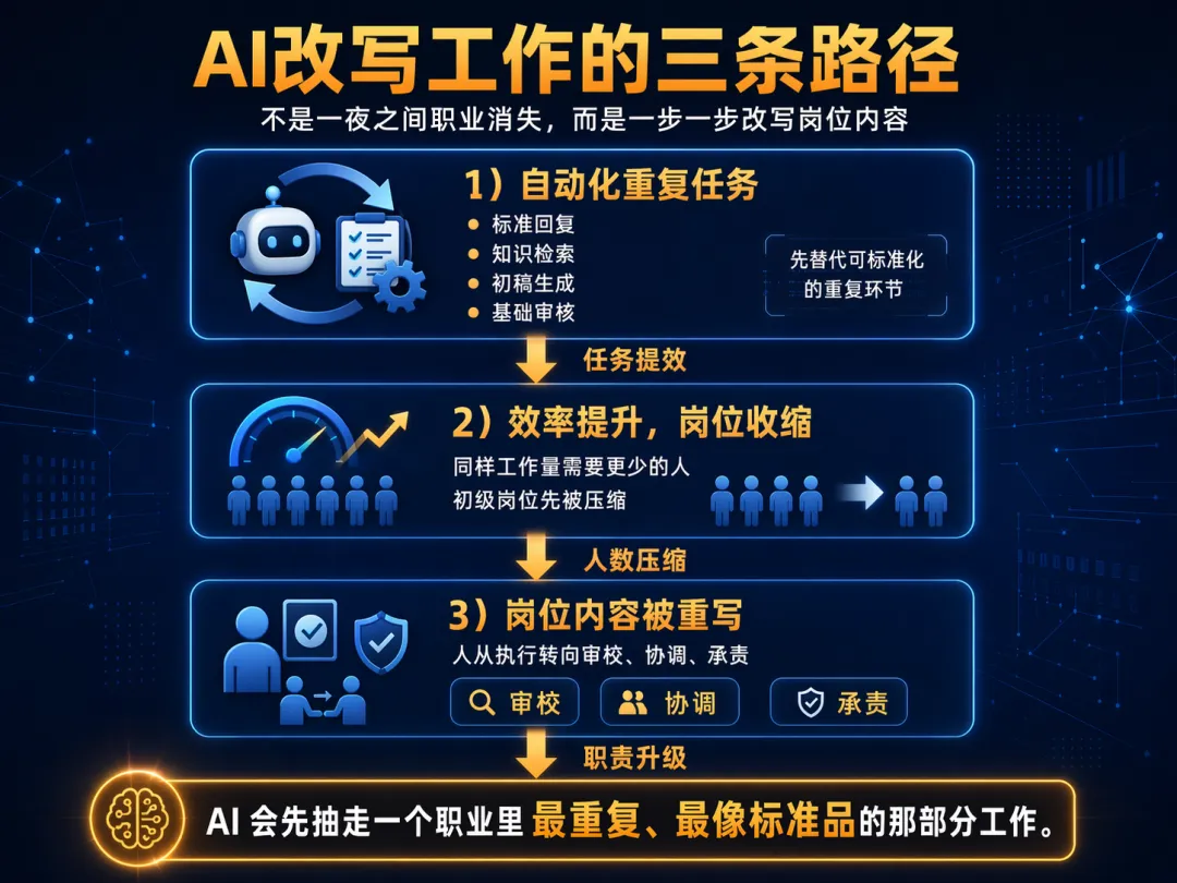 📌 图注:AI改写工作的主要路径,不是“一夜之间职业消失”,而是先自动化重复任务、再压缩岗位数量、最终重写岗位内容,把人推向审校、协调与承责。