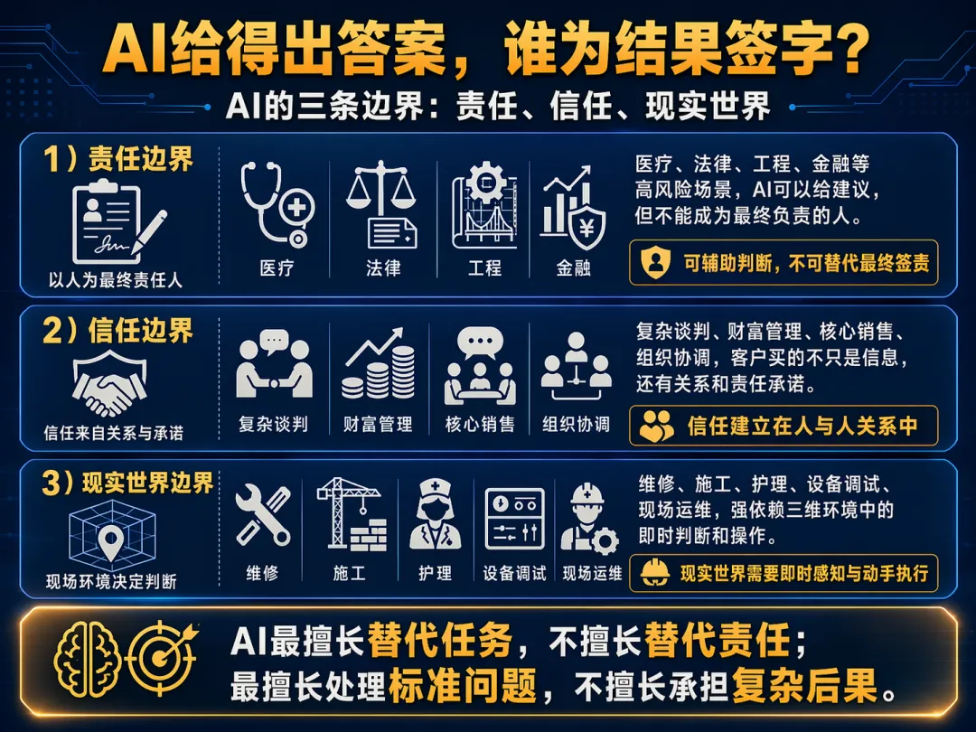 📌 图注:AI的边界主要体现在三处:责任、信任与现实世界。它擅长处理标准问题,但并不擅长承担复杂后果,也不能轻易替代需要签字背书的人。