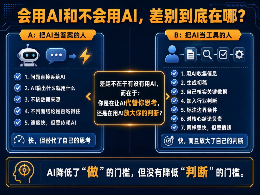 📌 图注:真正拉开差距的,不是“有没有用AI”,而是“你是在让AI代替你思考,还是在用AI放大你的判断”。同样使用AI,人与人之间的差距反而可能被进一步拉大。