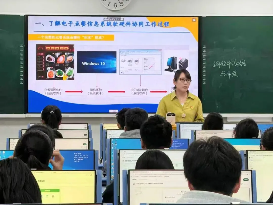 课堂伊始,马毅蕊老师以贴近校园生活的真实议题——“学校餐厅的数字化转型”巧妙破题。她现场借助AI技术即时生成点餐界面,直观引导学生思考“这是否属于信息系统软件”,将前沿科技应用自然融入课堂导入,瞬间点燃了学生的探究热情。随后,马毅蕊老师紧扣点餐场景展开课堂教学,用通俗易懂的“软件分类我能行”实操演练拆解抽象专业概念,引导学生自主辨析系统软件与应用软件的功能差异,夯实软件开发理论基础,让学生清晰地理解“软件与硬件如何高效协作”,在沉浸式思考中完成知识建构。