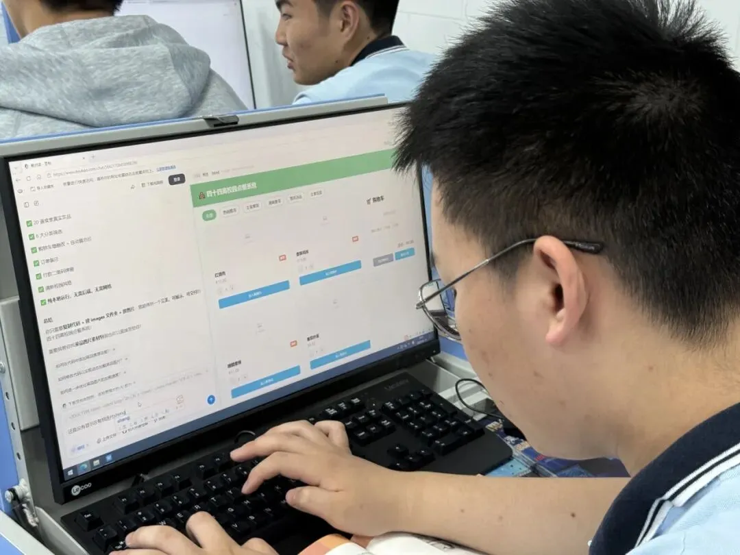 最具实践意义的活动三来了!学生们以小组为单位,分别扮演“产品经理”、“设计师”、“程序员”、“测试员”四个角色,利用豆包AI工具完成点餐软件前端界面开发。从界面布局到功能交互设计,从代码编写到系统测试,同学们各司其职、热烈讨论,亲手将创意转化为可交互的软件原型,真切体会到软件开发从0到1的完整开发过程,学生也更加深刻地体验到从想法到成果产出的思维蜕变与AI赋能的问题解决能力。
