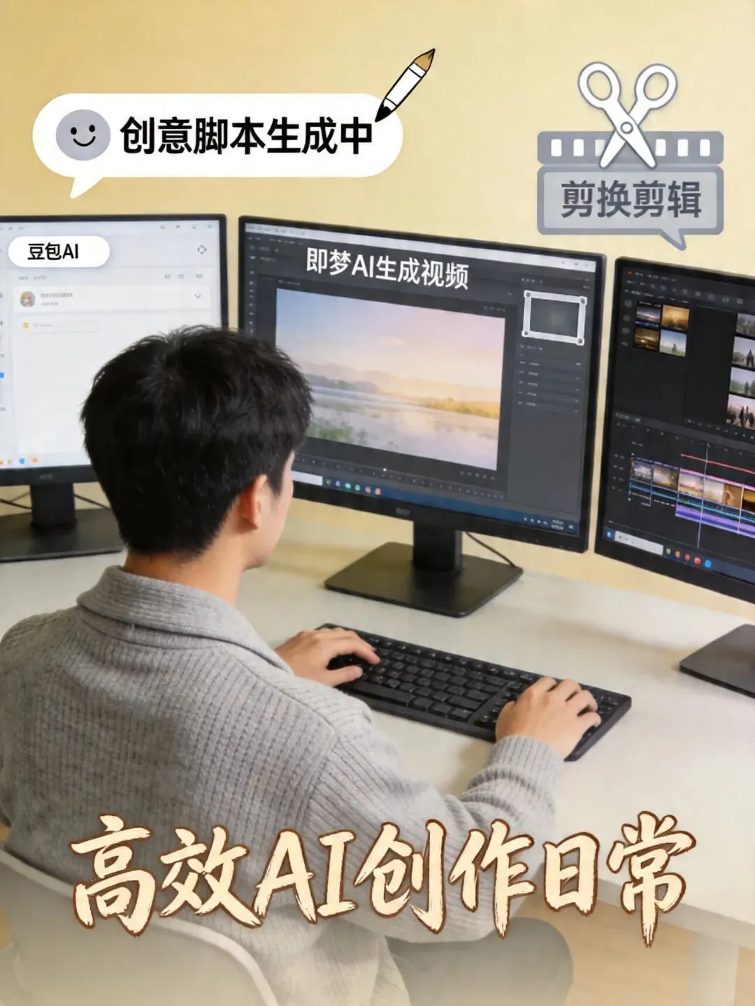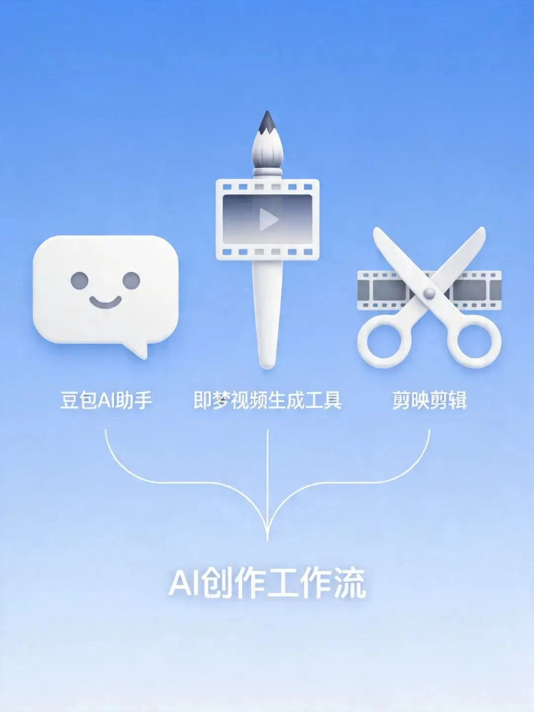 豆包负责创意文案,即梦负责画面生成,剪映负责精剪包装,三者联动从想法到成片,流程极度顺畅。