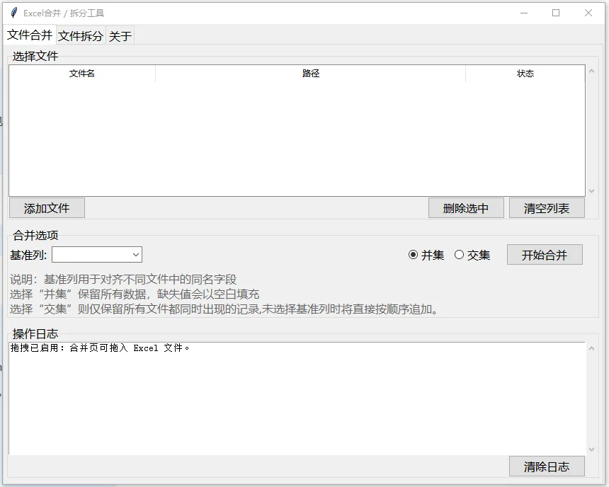 Excel 合并拆分工具,支持多份 Excel 文件按基准列以 “并集 / 交集” 模式合并(缺失值使用空白填充),也可将单个 Excel 文件按行范围、列范围、基准列分类拆分(支持拆分为多文件或同一文件的不同工作表),支持文件夹 / 文件拖拽选择。