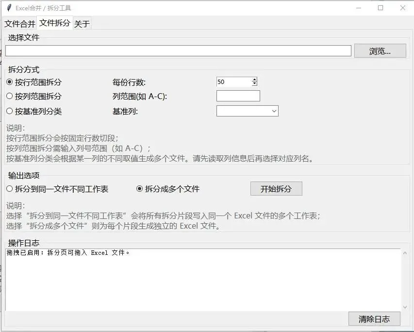 选择要拆分的 Excel 文件(支持拖拽)