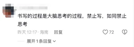 “书写的过程是大脑思考的过程,禁止写,如同禁止思考。”(这条评论获得了72个赞,高居榜首。)