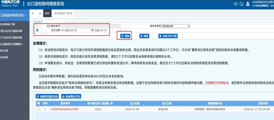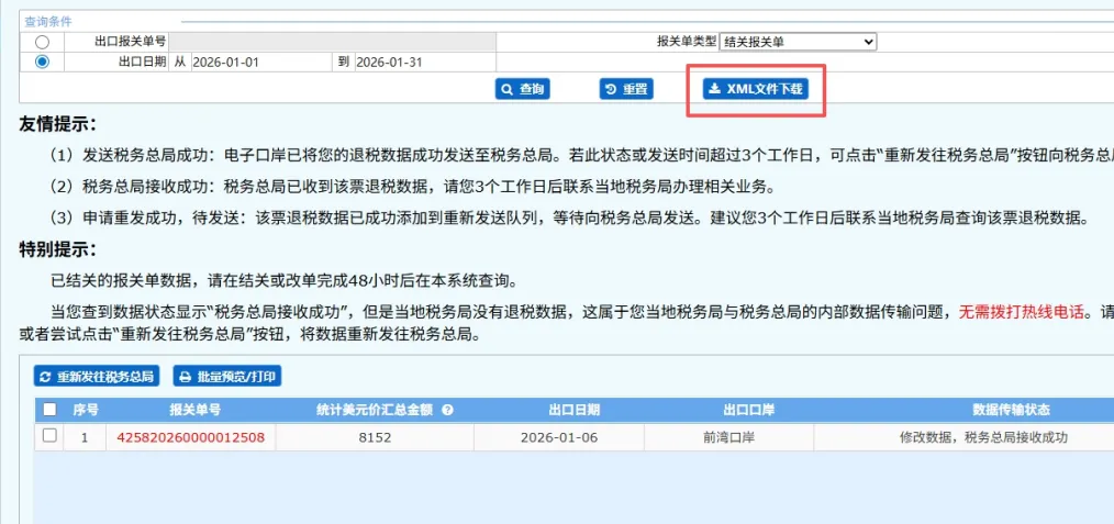 选择出口日期区间(如某月 1 日–月末),可一次性导出当月所有结关报关单退税联。