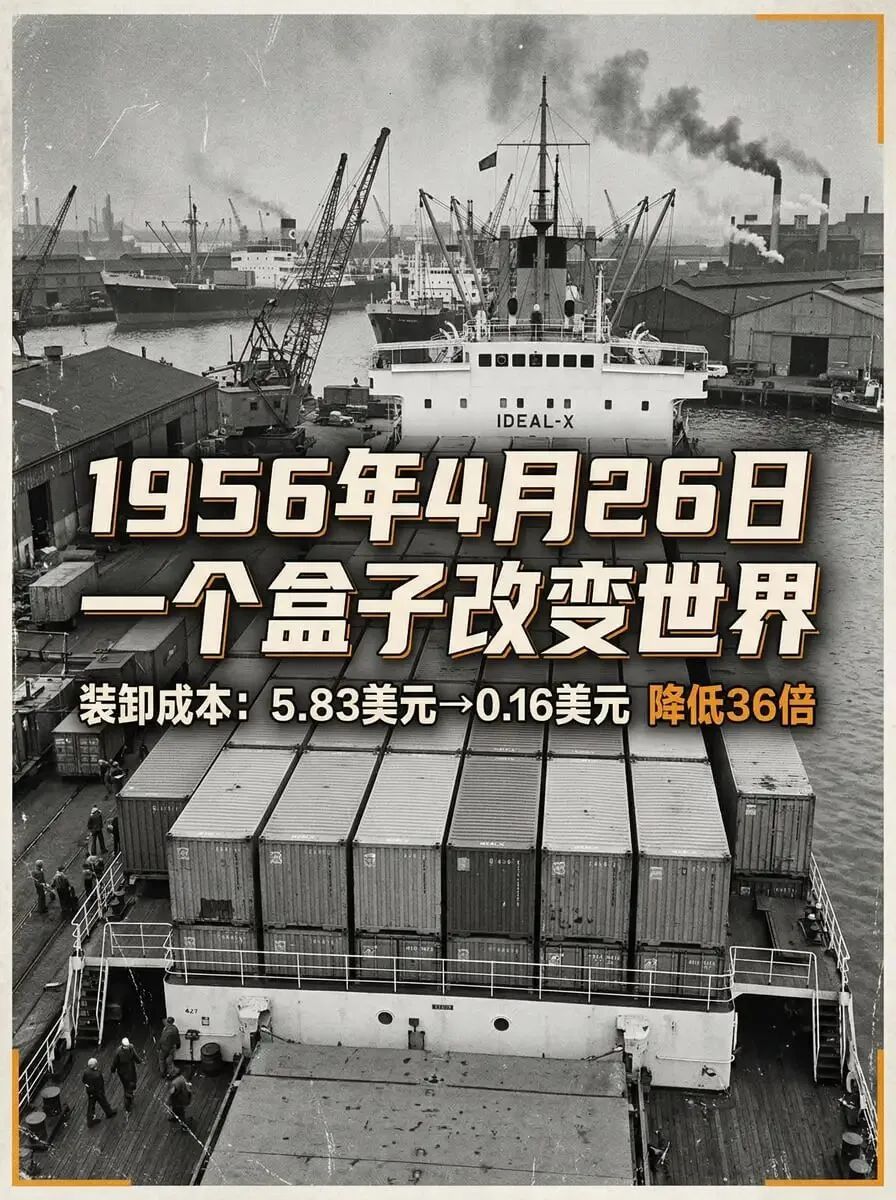第一次航行的数据是这样的:散装货从纽约码头装船的成本,一吨 5.83 美元;Ideal-X 上装集装箱的成本,一吨 0.16 美元——降了 36 倍。接下来 40 年,国际海运成本又降了 90%,全球贸易体量涨了 10 倍。Marc Levinson 在《The Box》里的结论很硬:没有集装箱,就没有今天的全球化。