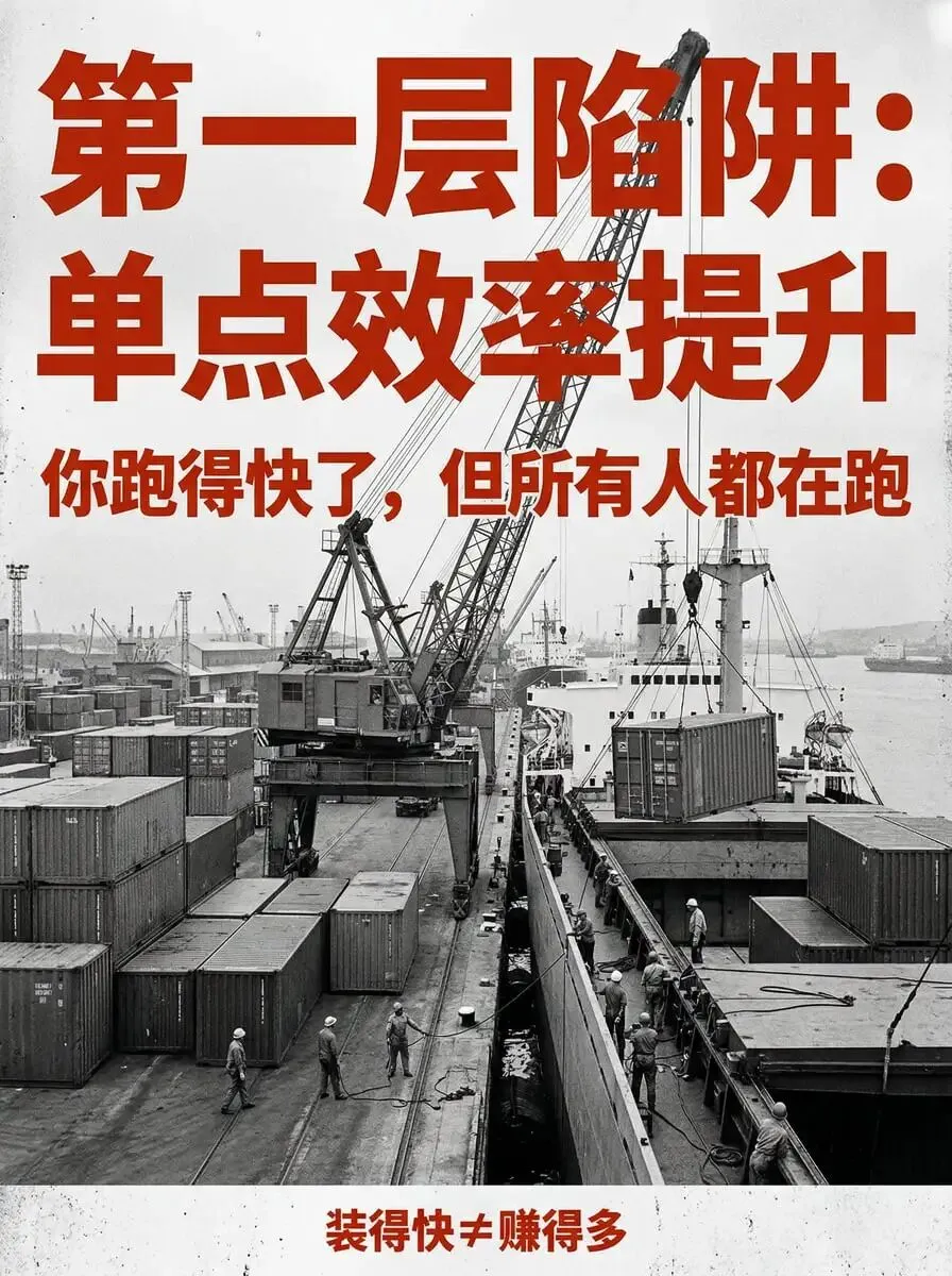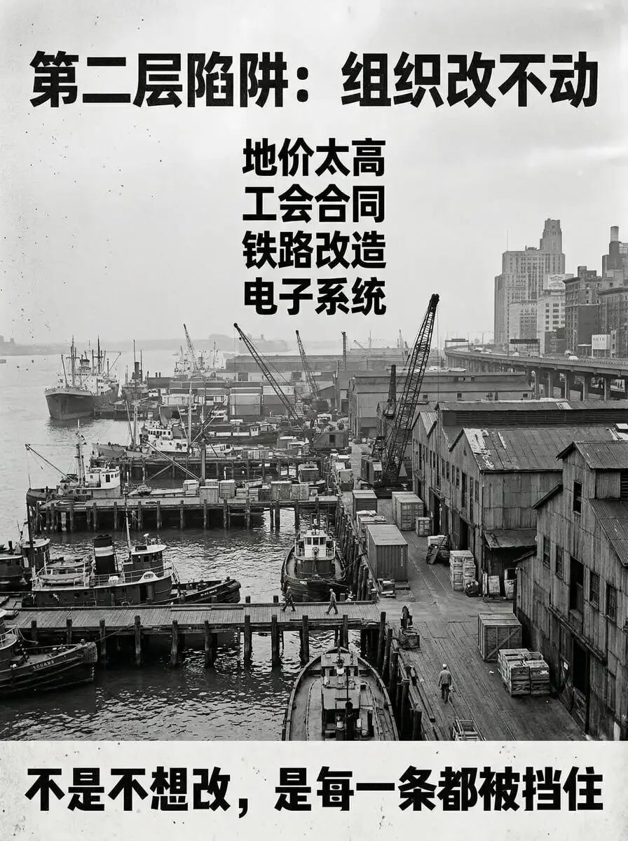 纽约港的问题也是这个:它吸收的是单点的效率改进——”装卸更快”——而不是整套体系的重构。就好像只换了发动机,但底盘、传动、悬挂全是旧的。跑不起来。