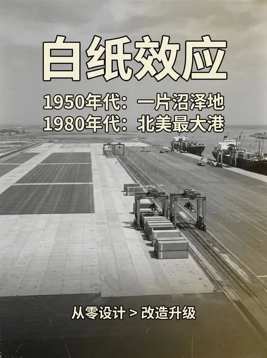 而哈德逊河对岸的新泽西 Elizabeth 港,1950 年代还是一片沼泽地。没有港口历史,没有人才积累,没有腹地优势。唯一有的是一张白纸。1958 年新泽西港务局决定把 Elizabeth 港完全为集装箱从零设计——堆场、铁路、公路、工会、系统,全是新的。1962 年开港,1970 年代超过纽约,1980 年代成为北美最大集装箱港之一。几公里外的纽约港在同一时期基本停摆。今天曼哈顿下城的老码头区变成了南街海港博物馆和一片奢侈公寓。