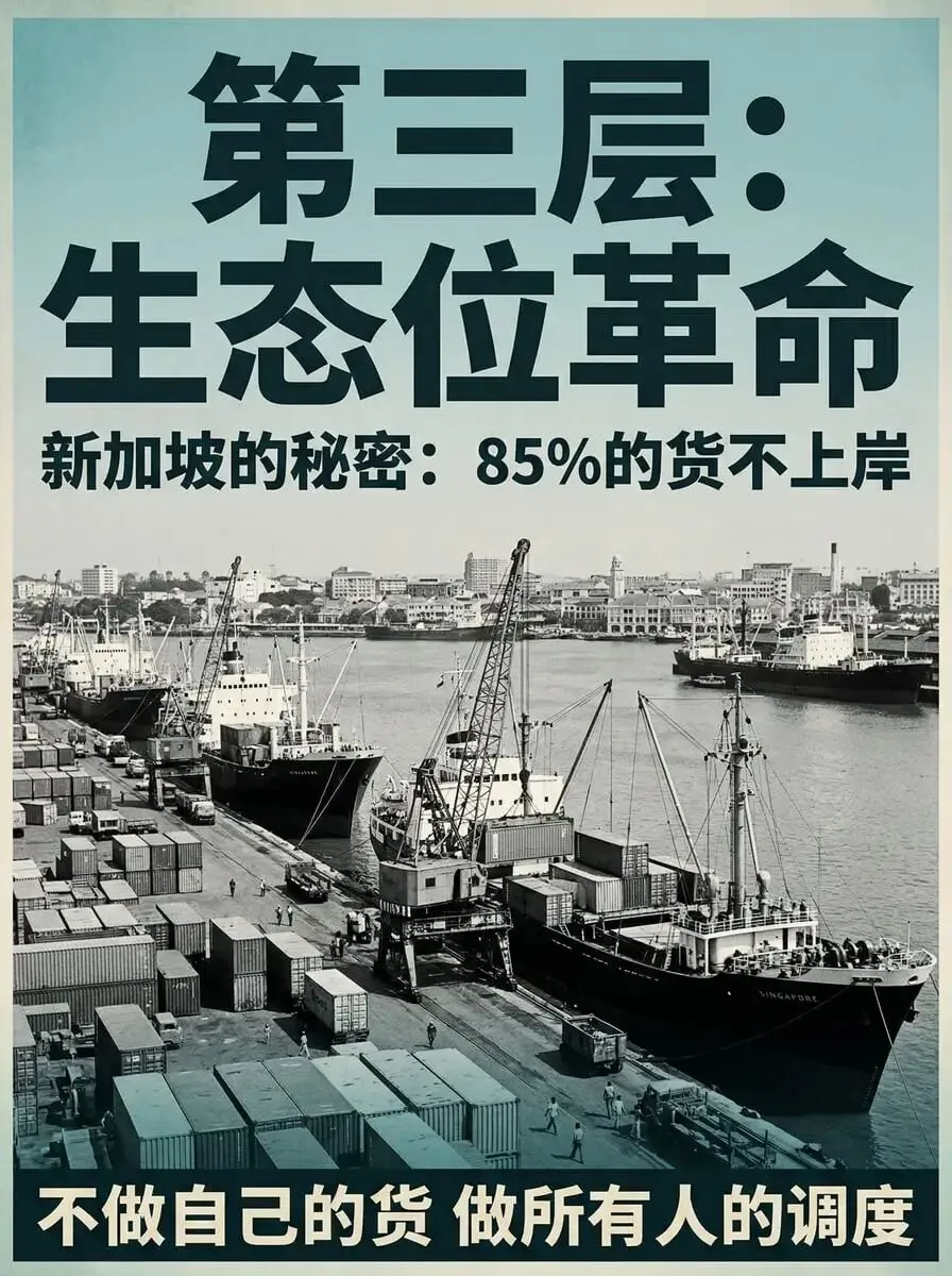 新加坡的成功不是靠”把自己的货运得更好”,而是靠看到了一个以前不存在的生态位——集装箱把各环节的摩擦打到极低之后,”谁来帮所有人高效配合”这个协调者的位置,从零长了出来。