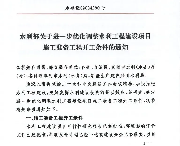 水建设〔2024〕90号 PDF文件 水利部进一步优化调整水利工程建设项目施工准备工程开工条件的通知
