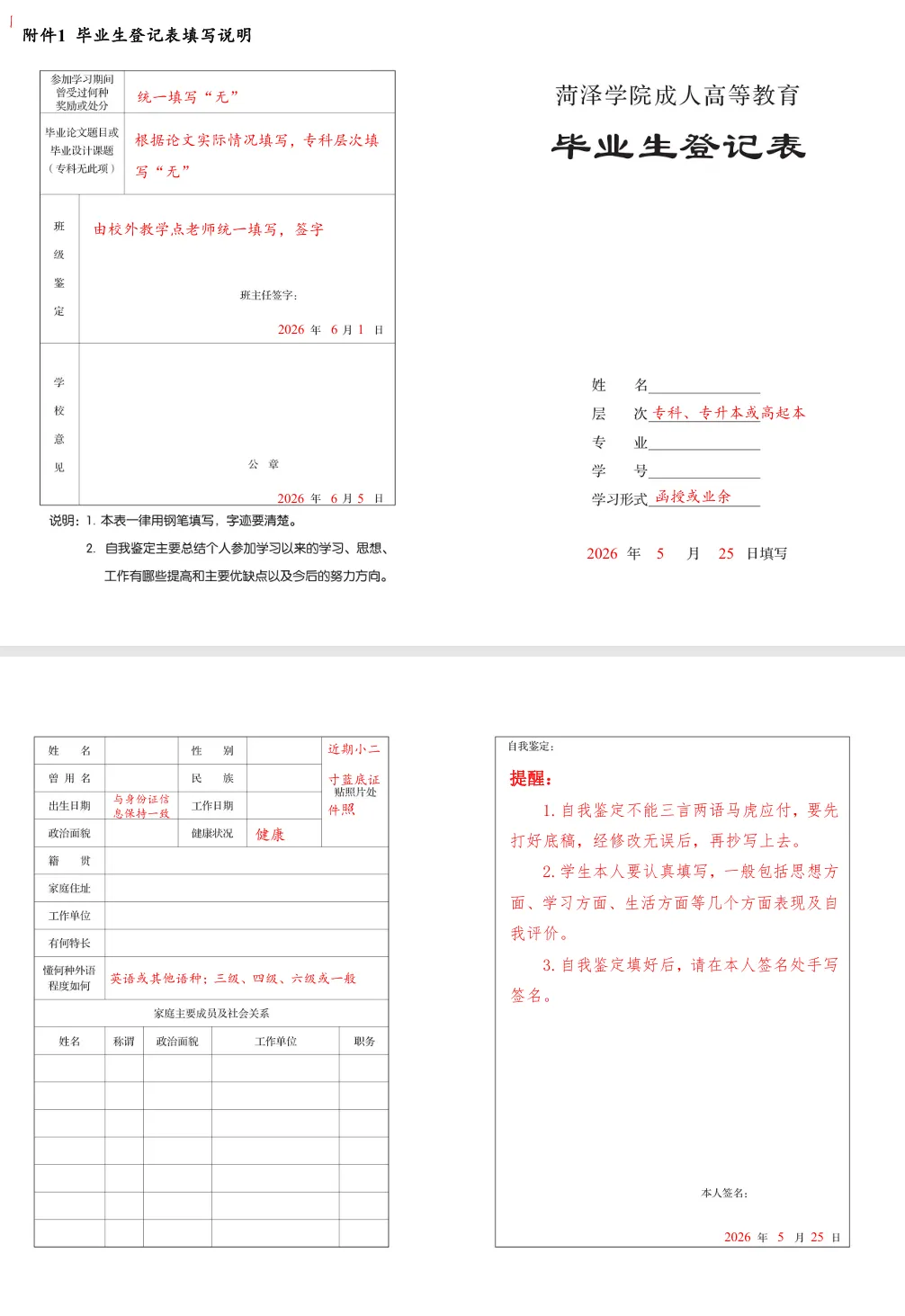 为规范做好菏泽学院2026年夏季成人高等毕业生《毕业生登记表》( 以下简称《登记表》)填报工作,确保信息填写的完整性、准确性和规范性,现就有关事项通知如下: