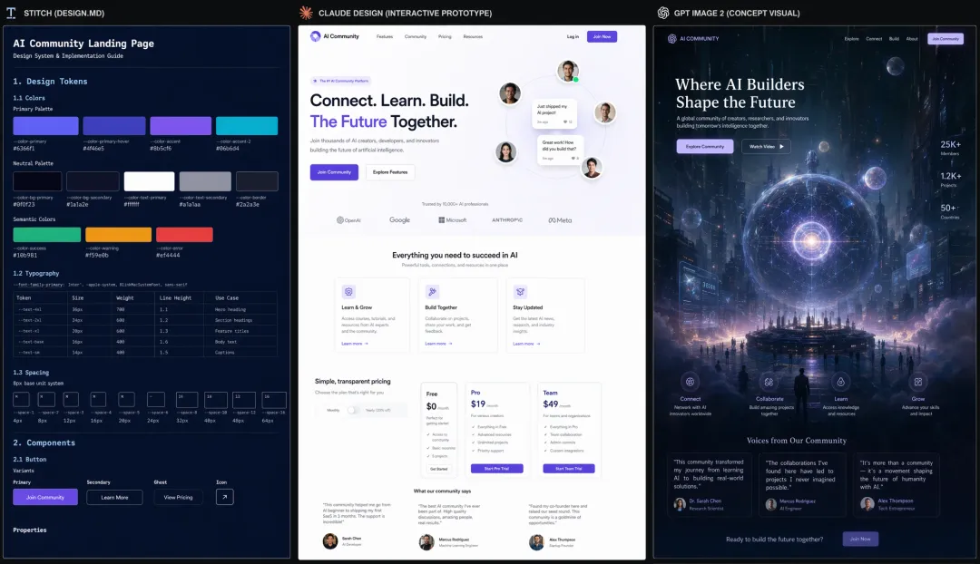 我在同一台设备上跑了三个工具,用同一套设计需求:为一个AI社区产品设计着陆页,包含hero区域、功能介绍、定价区块和三组用户证言。