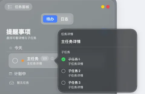 这个工具是一个任务管理的工具,可以添加任务,鼠标悬浮在任务上就可以看子任务和详情,每做完一个字任务就可以勾选划掉,子任务全完成主任务自动划掉,自动保存日志,当天所有完成的任务都会保存下来