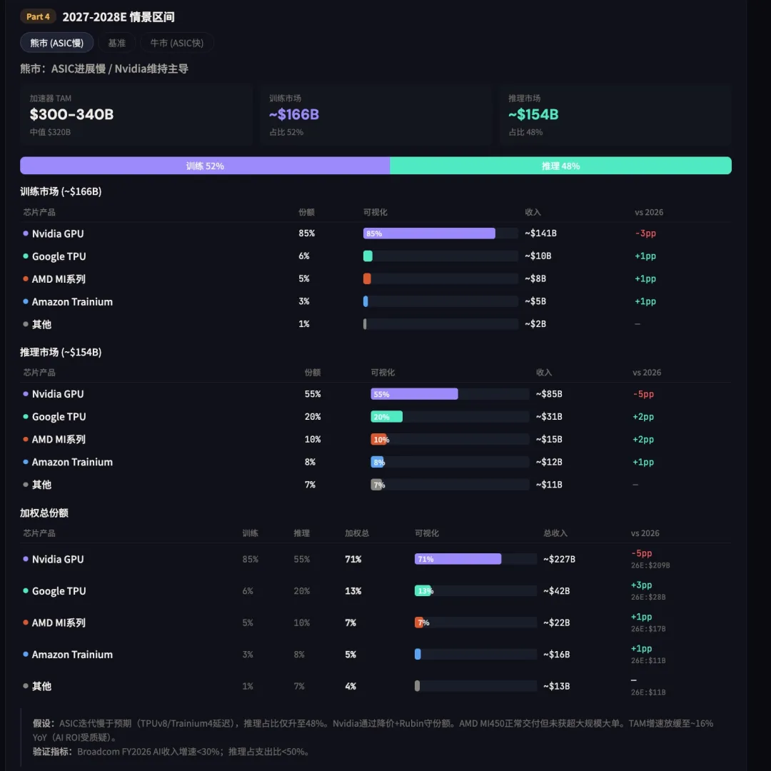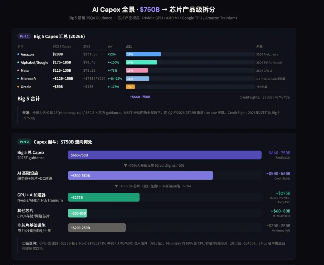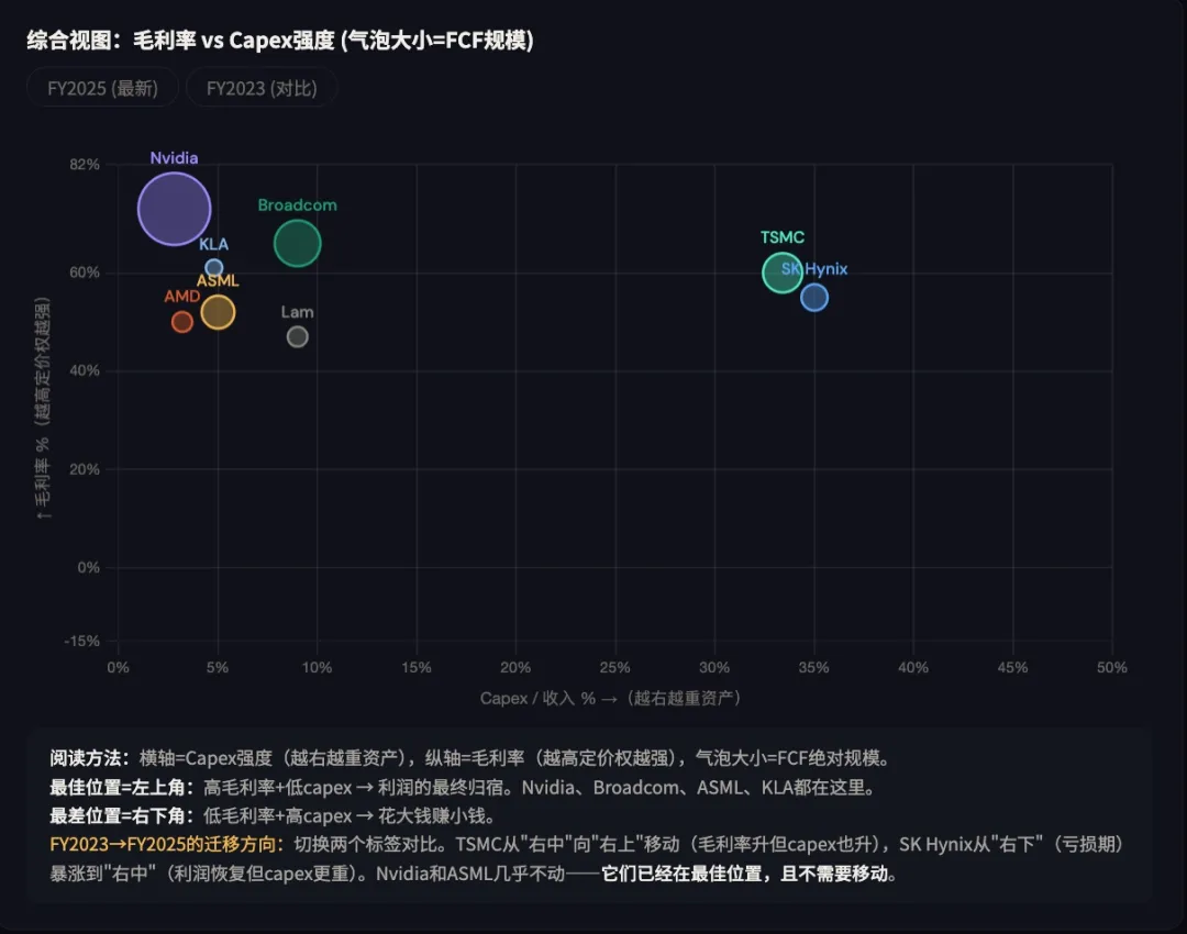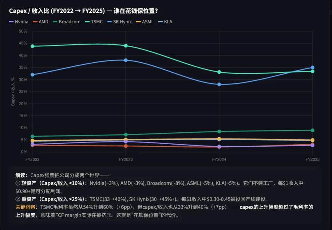 → 核心观察: Fabless 设计公司(Nvidia、AMD、Broadcom)的 CapEx/收入比常年低于 5%,AI 周期中甚至有所下降(因为收入爆发而 CapEx 没同步增加);TSMC 的 CapEx/收入比长期在 40-45%,SK Hynix 在 30-35%,ASML 在 5-8%(设备厂本身也是相对轻资产)。