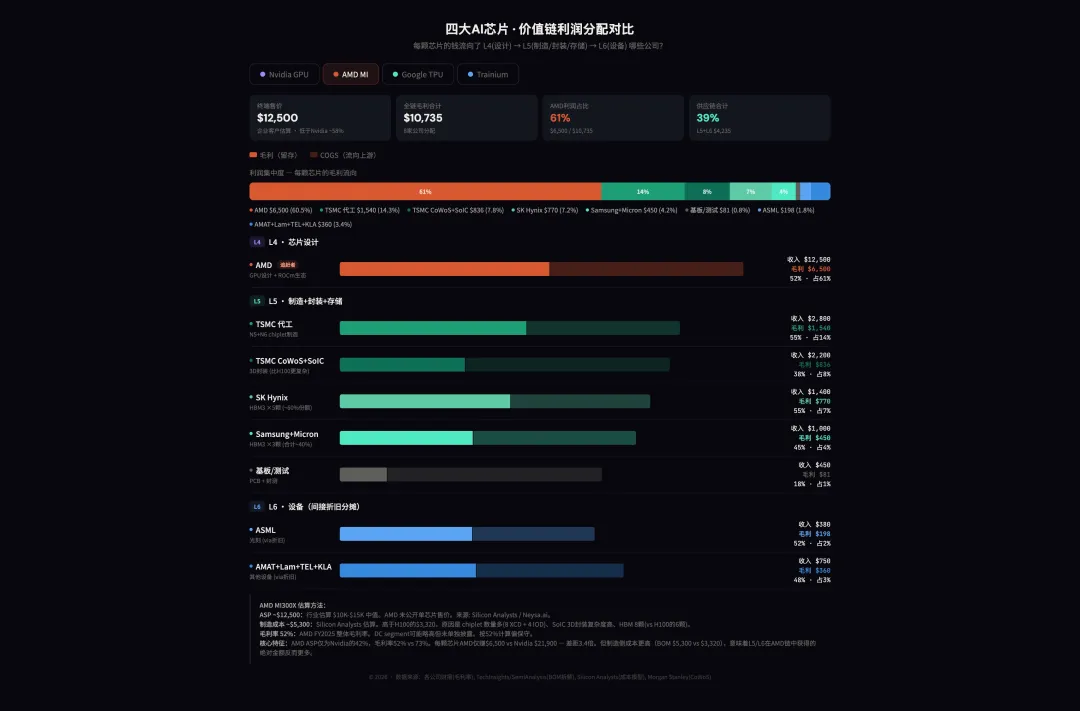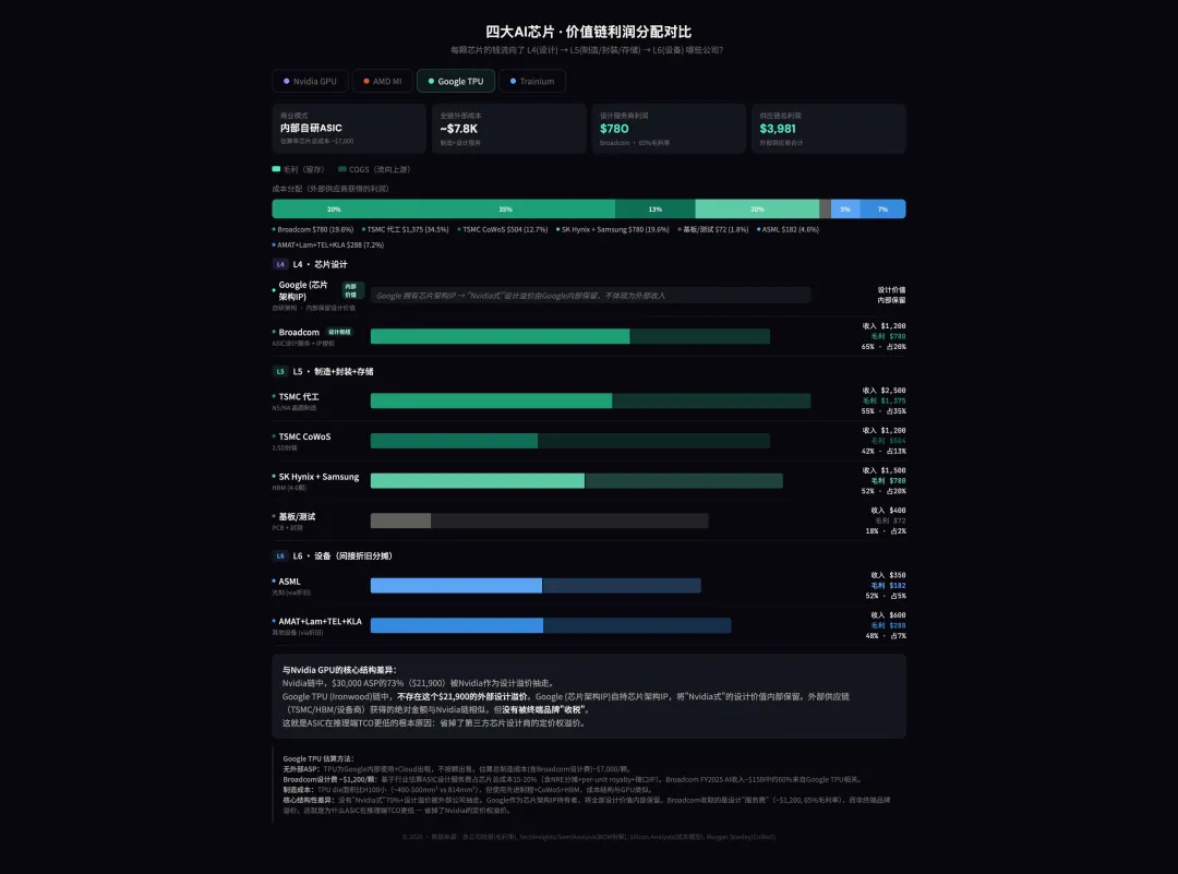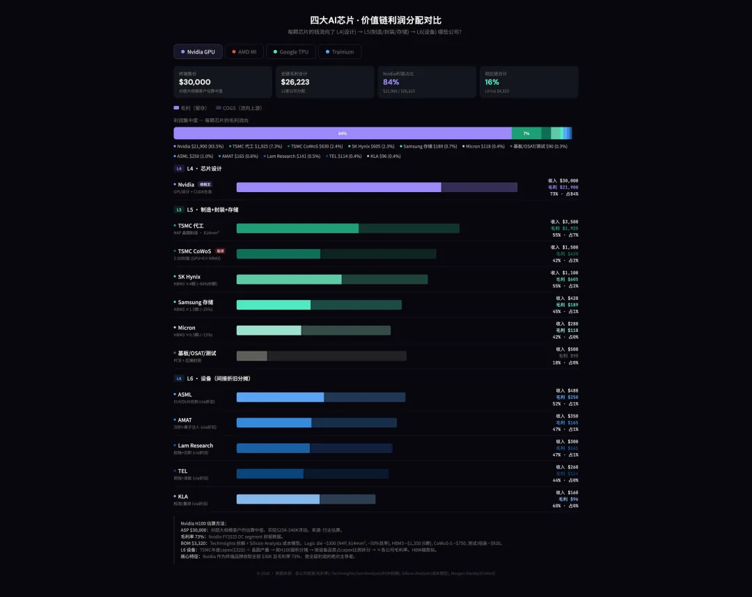 → 核心观察: Nvidia 的毛利率从 AI 周期前的 60% 左右飙升至 75%+,且领先身位持续扩大;Broadcom、KLA 的毛利率稳步抬升;TSMC 从 50% 左右稳步提升至 55%+,但绝对值仍比设计层低 15-20 个百分点;而设备厂商(Lam/AMAT/TEL)、存储厂商(Samsung/Micron 在 HBM 之外)毛利率几乎没有受益于 AI 周期。