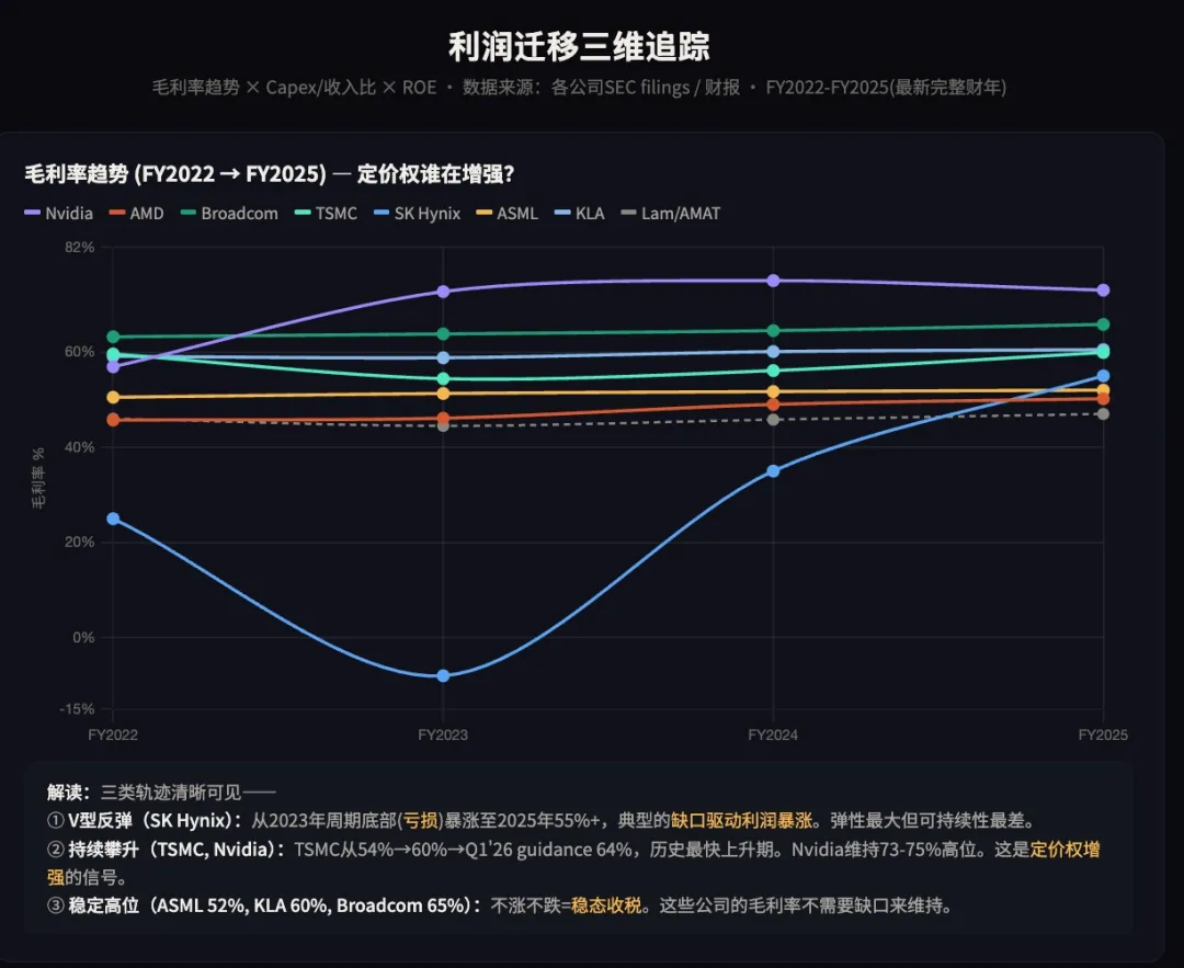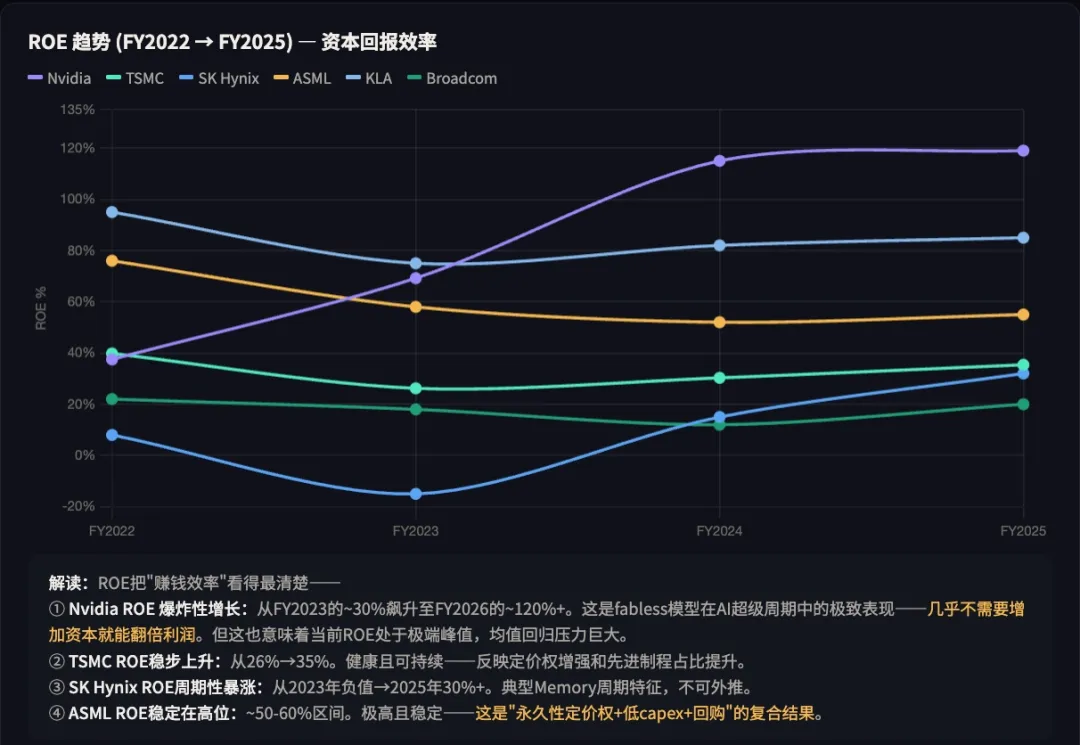 → 核心观察: Nvidia 的 ROE 在 AI 周期内出现断层式飙升,从 30% 左右跃升到 100%+;Broadcom 的 ROE 也显著抬升;而 TSMC 的 ROE 虽有提升(从 25% 到 30% 左右),幅度远小于设计层公司;SK Hynix 的 ROE 波动较大(受存储周期影响),HBM 只带来了一个阶段性窗口,还没有彻底改写它的周期性特征。