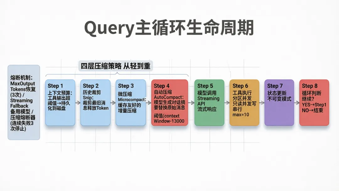 这个循环的精妙之处在于每次迭代前的四层上下文压缩。在第⑤步,如果对话太长,系统会启动AutoCompact——用模型自身生成对话摘要,替换原始消息。这确保了Agent可以无限期运行,不会因为上下文溢出而崩溃。