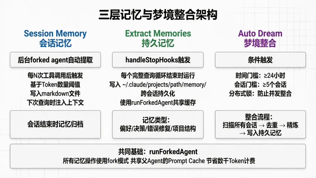 Auto Dream是最有趣的设计。它模仿人类的睡眠整合机制——当积累了足够多的会话(默认≥5个)且经过足够长的时间(默认≥24小时),系统启动一个后台Agent来整合所有会话的记忆,去除重复、提炼关键信息。