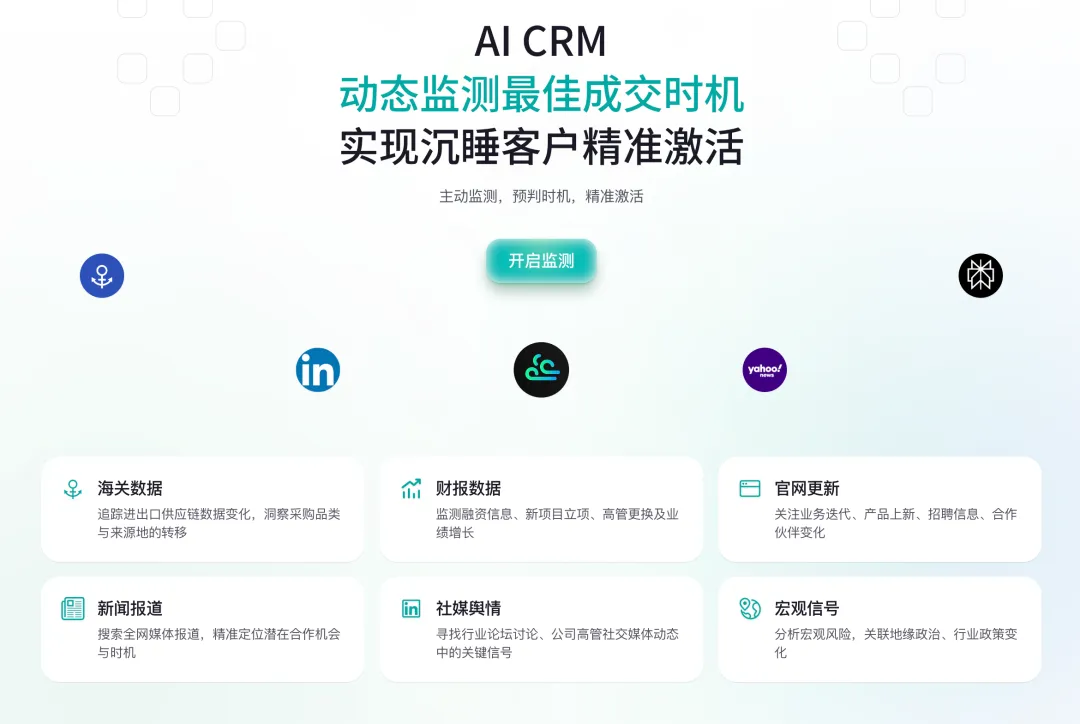 AI 搜索全球企业实时数据,专为制造业、工业产品优化,将您的产品描述与意向行业的潜在客户信息进行智能比对,自动过滤低相关性无效数据,从搜索引擎、行业展会、海关数据、企业数据库、地图获客、社媒、领英开发等多渠道一站式网罗高质量销售线索与联系方式,找到意想不到的客户!