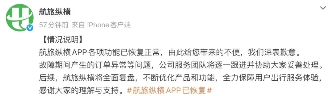这么长时间的故障,对品牌伤害很大,希望经过这次惨痛教训后,航旅纵横的技术水平能有实质性的提升吧。