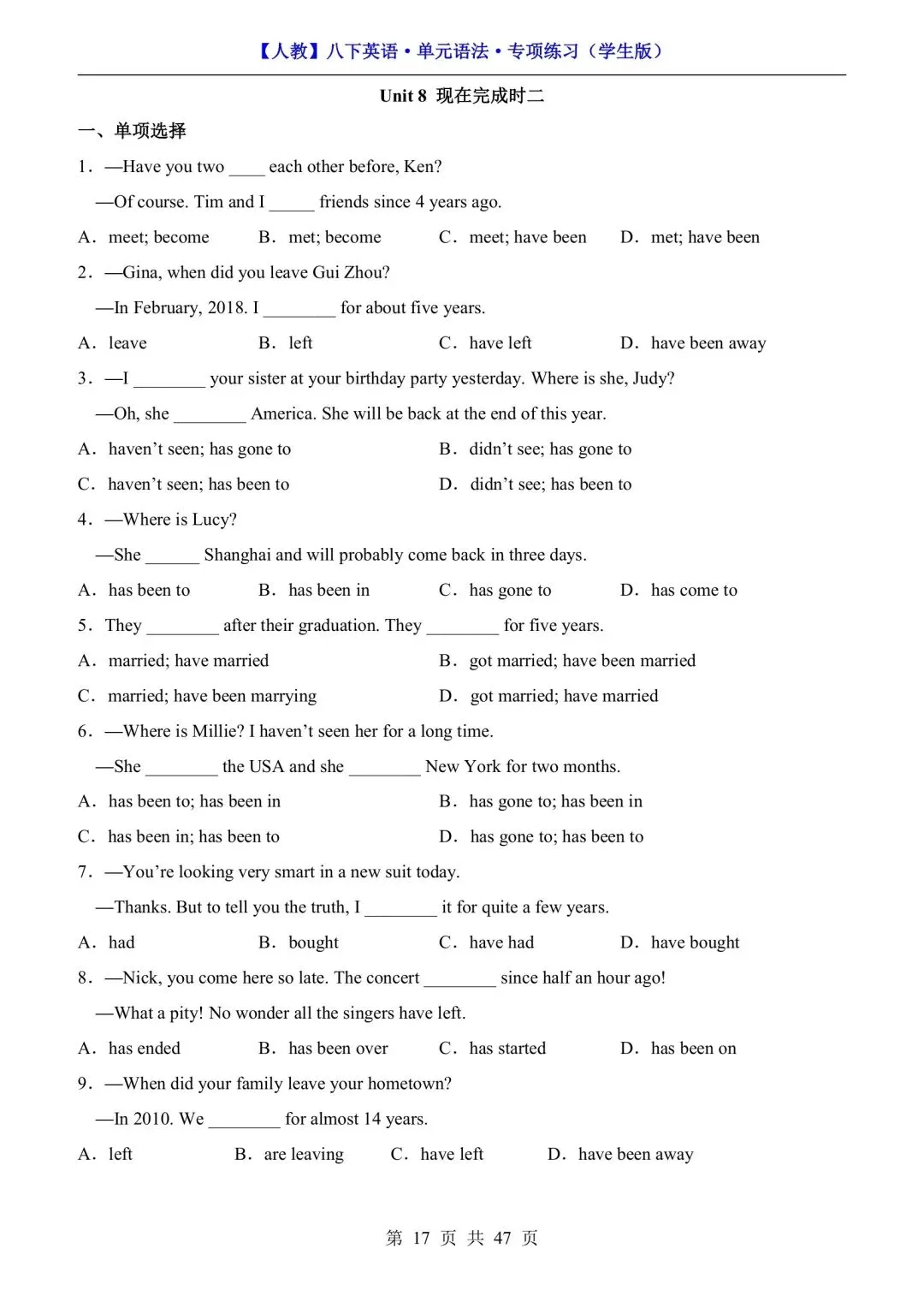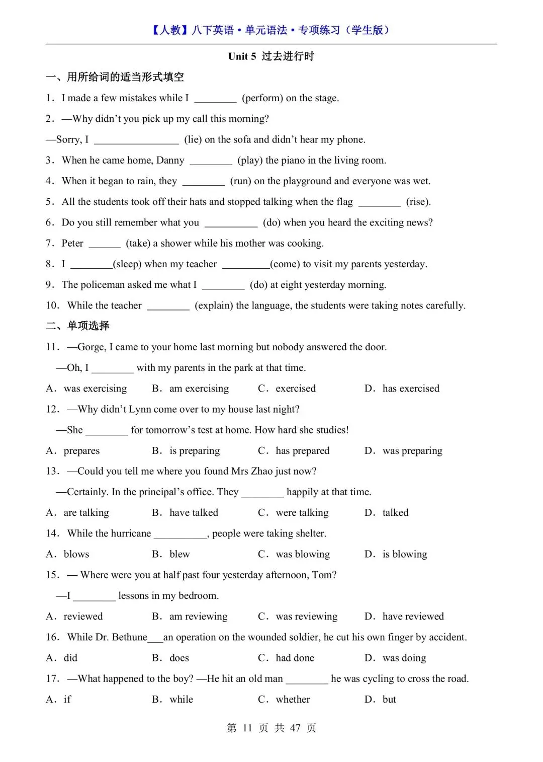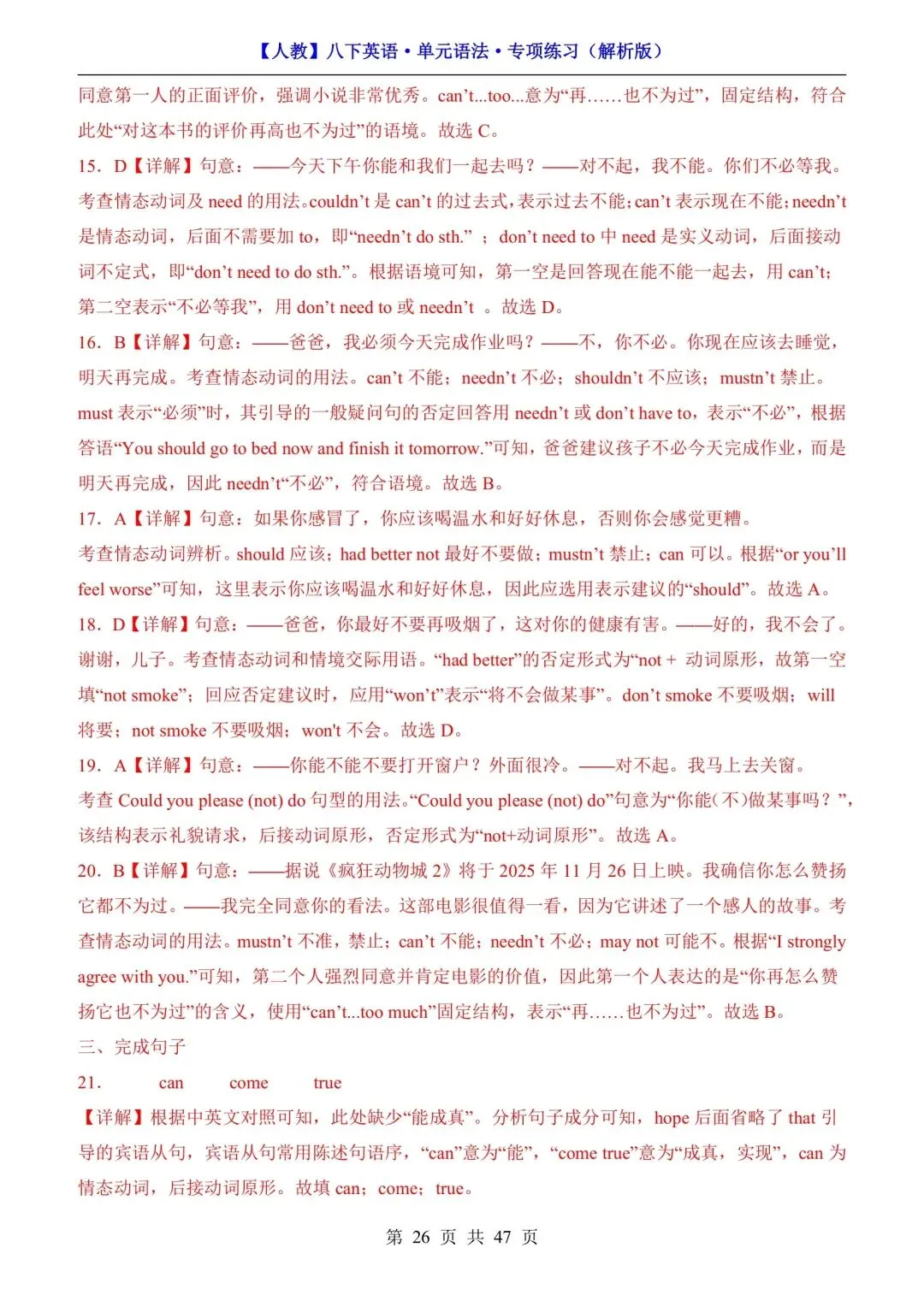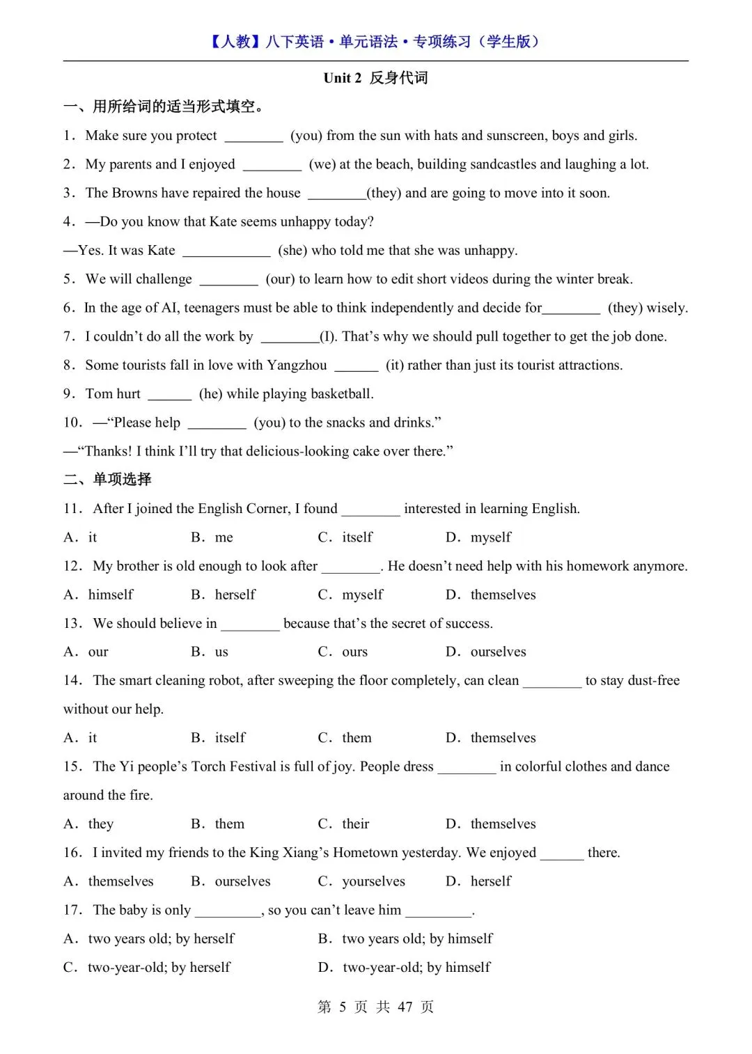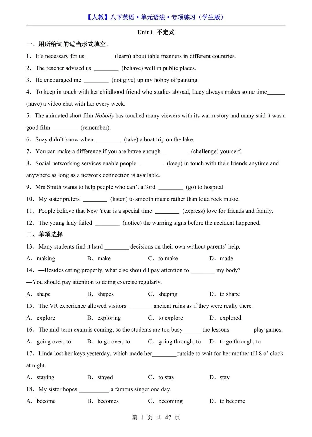 【人教】八下英语单元语法专项练习(可下载打印) 资源下载见图片底部 资源介绍 电子版PDF文档 网盘下载链接详见页面底部 ▼内容预览▼ 版面所限,此处仅展示部分内容 完整版电子版👇 获取完整电子版方式 👇 点击下方卡片关注 进入“瑶瑶妈妈爱学习”的后台 发送消息 资料下载 获取打印电子版方式 重要说明 版权声明: 本公众号分享的资源,所有文件版权归原作者所有,如有侵权可以联系本人删除。本公众号尊重版权,有任何版权问题,可以直接在公众号留言,我看到后会回复。