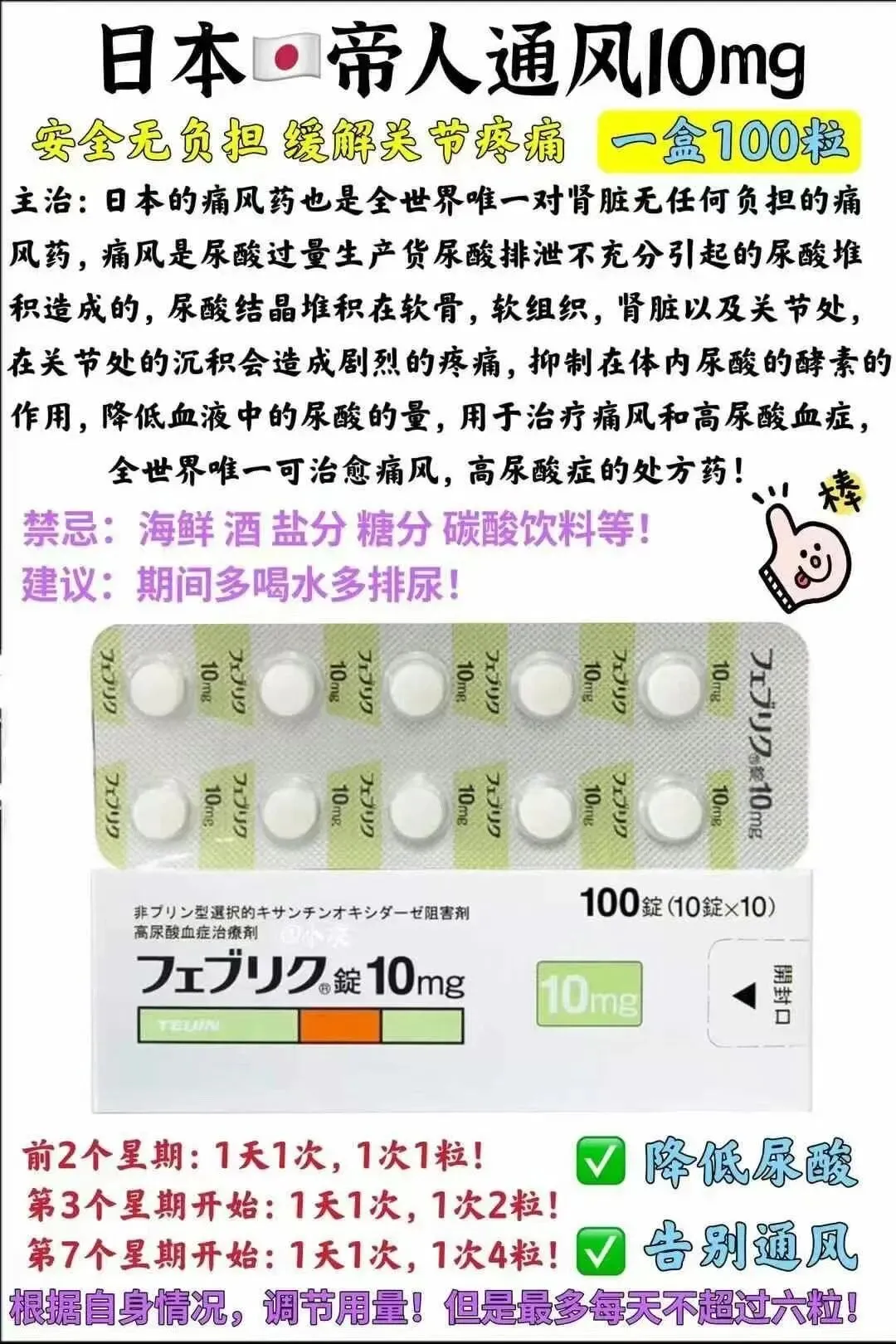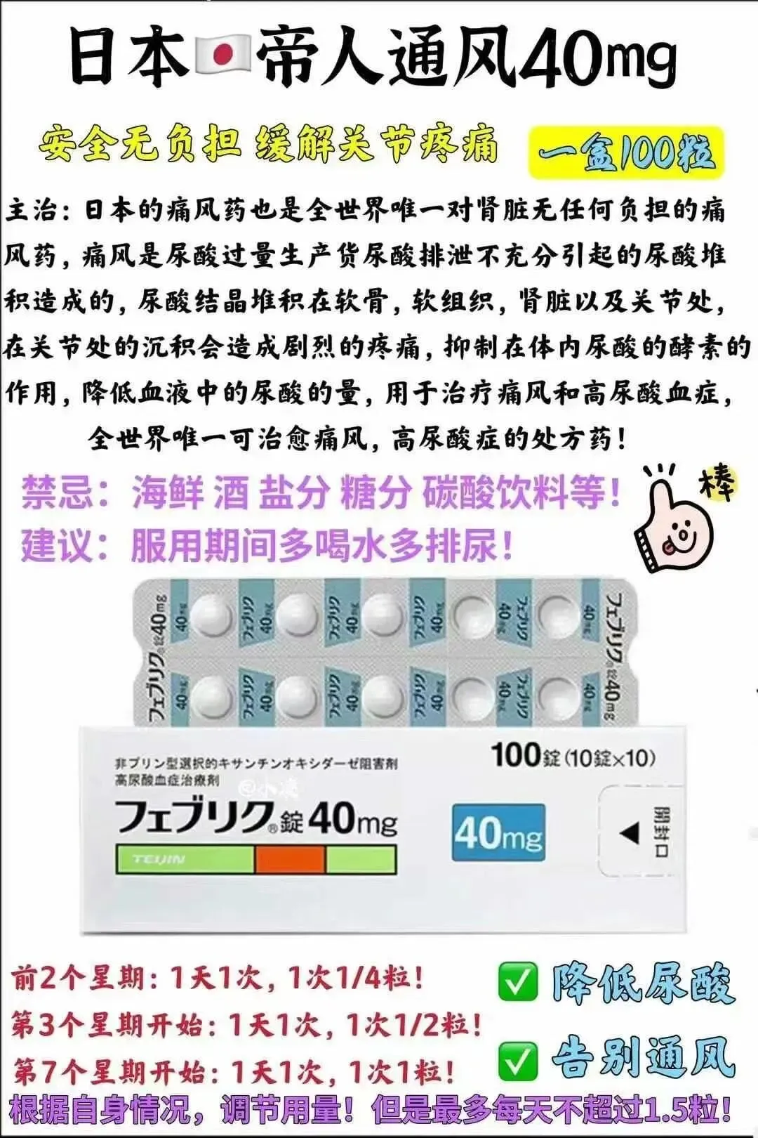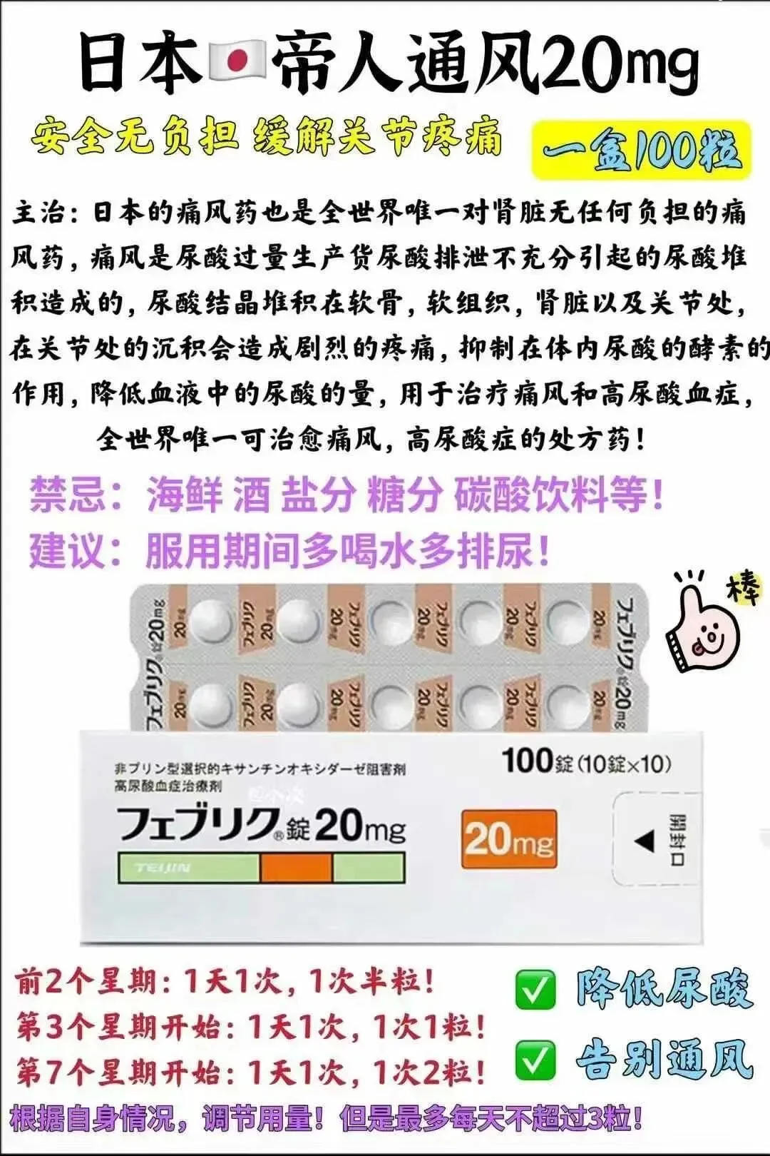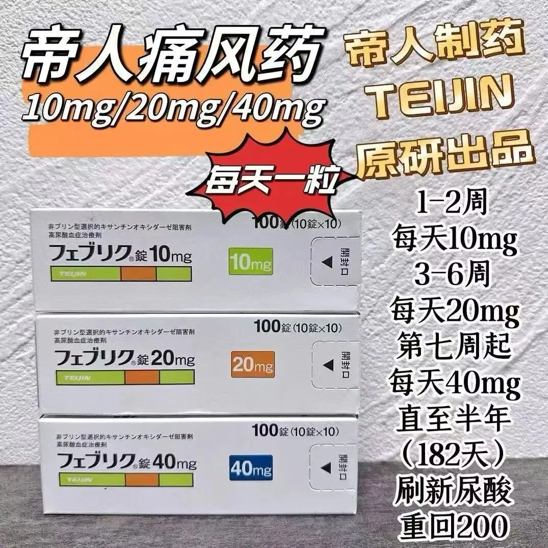 这款有3个款式,10mg,20mg,40mg,都是新包装,帝人痛风新包装100粒装,主治:痛风,高尿酸血症。