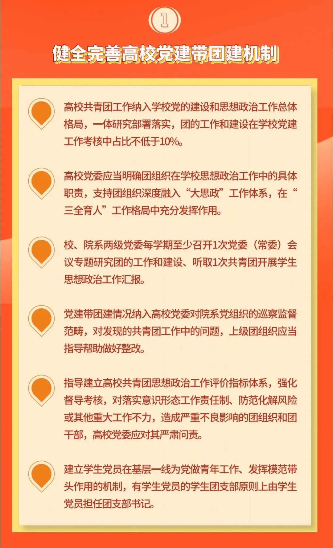 1. 健全完善高校党建带团建具体机制。高校党委应当拿出极大精力抓共青团工作,着力强化政治领导、思想领导、组织领导。高校共青团工作纳入学校党的建设和思想政治工作总体格局,一体研究部署落实,团的工作和建设在学校党建工作考核中占比不低于10%。高校党委应当明确团组织在学校思想政治工作中的具体职责,支持团组织深度融入“大思政”工作体系,在“三全育人”工作格局中充分发挥作用。校、院系两级党委每学期至少召开1次党委(常委)会议专题研究团的工作和建设、听取1次共青团开展学生思想政治工作汇报。党建带团建情况纳入高校党委对院系党组织的巡察监督范畴,对发现的共青团工作中的问题,上级团组织应当指导帮助做好整改。指导建立高校共青团思想政治工作评价指标体系,强化督导考核,对落实意识形态工作责任制、防范化解风险或其他重大工作不力,造成严重不良影响的团组织和团干部,高校党委应对其严肃问责。建立学生党员在基层一线为党做青年工作、发挥模范带头作用的机制,有学生党员的学生团支部原则上由学生党员担任团支部书记。