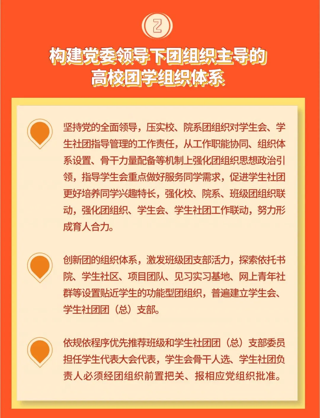 2. 构建党委领导下团组织主导的高校团学组织体系。坚持党的全面领导,压实校、院系团组织对学生会、学生社团指导管理的工作责任,从工作职能协同、组织体系设置、骨干力量配备等机制上强化团组织思想政治引领,指导学生会重点做好服务同学需求,促进学生社团更好培养同学兴趣特长,强化校、院系、班级团组织联动,强化团组织、学生会、学生社团工作联动,努力形成育人合力。创新团的组织体系,激发班级团支部活力,探索依托书院、学生社区、项目团队、见习实习基地、网上青年社群等设置贴近学生的功能型团组织,普遍建立学生会、学生社团团(总)支部。依规依程序优先推荐班级和学生社团团(总)支部委员担任学生代表大会代表,学生会骨干人选、学生社团负责人必须经团组织前置把关、报相应党组织批准。