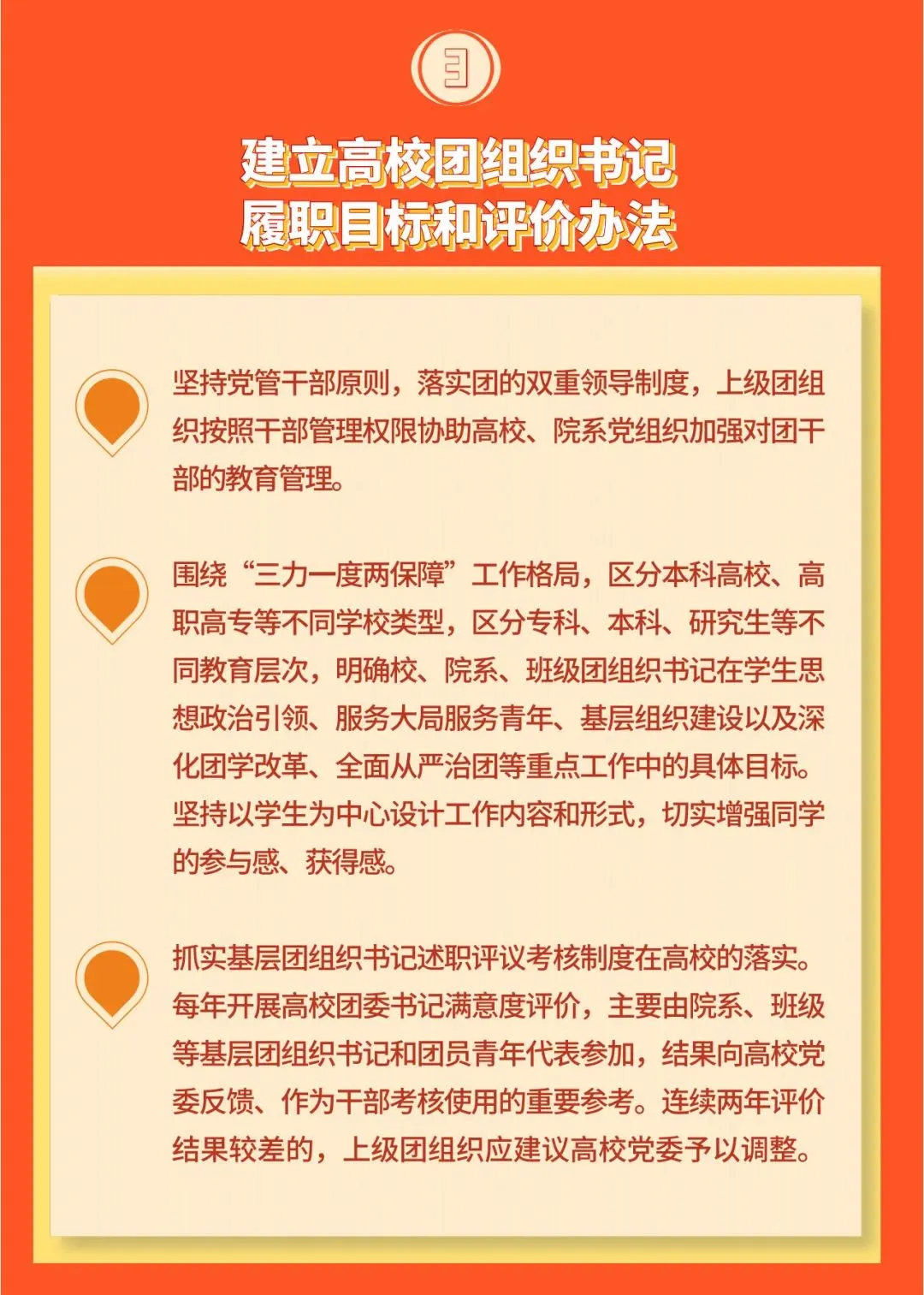 3. 建立高校团组织书记履职目标和评价办法。坚持党管干部原则,落实团的双重领导制度,上级团组织按照干部管理权限协助高校、院系党组织加强对团干部的教育管理。围绕“三力一度两保障”工作格局,区分本科高校、高职高专等不同学校类型,区分专科、本科、研究生等不同教育层次,明确校、院系、班级团组织书记在学生思想政治引领、服务大局服务青年、基层组织建设以及深化团学改革、全面从严治团等重点工作中的具体目标。坚持以学生为中心设计工作内容和形式,切实增强同学的参与感、获得感。抓实基层团组织书记述职评议考核制度在高校的落实。每年开展高校团委书记满意度评价,主要由院系、班级等基层团组织书记和团员青年代表参加,结果向高校党委反馈、作为干部考核使用的重要参考。连续两年评价结果较差的,上级团组织应建议高校党委予以调整。
