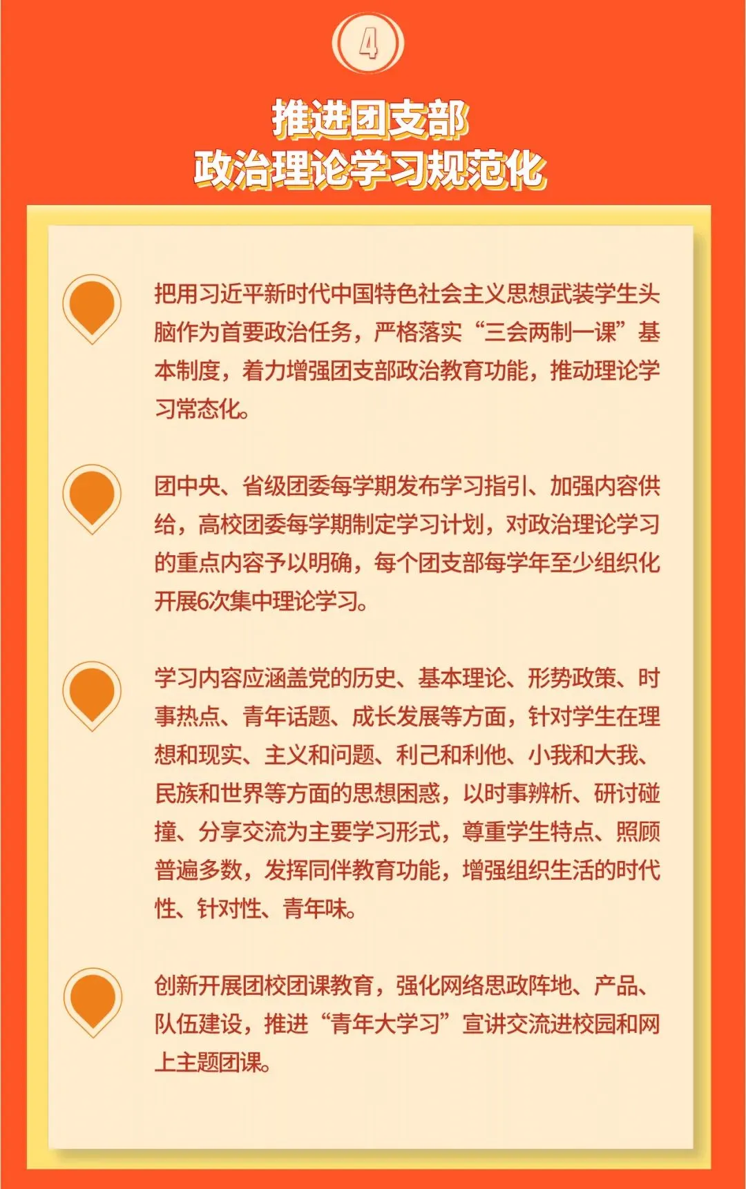 4. 推进团支部政治理论学习规范化。把用习近平新时代中国特色社会主义思想武装学生头脑作为首要政治任务,严格落实“三会两制一课”基本制度,着力增强团支部政治教育功能,推动理论学习常态化。团中央、省级团委每学期发布学习指引、加强内容供给,高校团委每学期制定学习计划,对政治理论学习的重点内容予以明确,每个团支部每学年至少组织化开展6次集中理论学习。学习内容应涵盖党的历史、基本理论、形势政策、时事热点、青年话题、成长发展等方面,针对学生在理想和现实、主义和问题、利己和利他、小我和大我、民族和世界等方面的思想困惑,以时事辨析、研讨碰撞、分享交流为主要学习形式,尊重学生特点、照顾普遍多数,发挥同伴教育功能,增强组织生活的时代性、针对性、青年味。创新开展团校团课教育,强化网络思政阵地、产品、队伍建设,推进“青年大学习”宣讲交流进校园和网上主题团课。