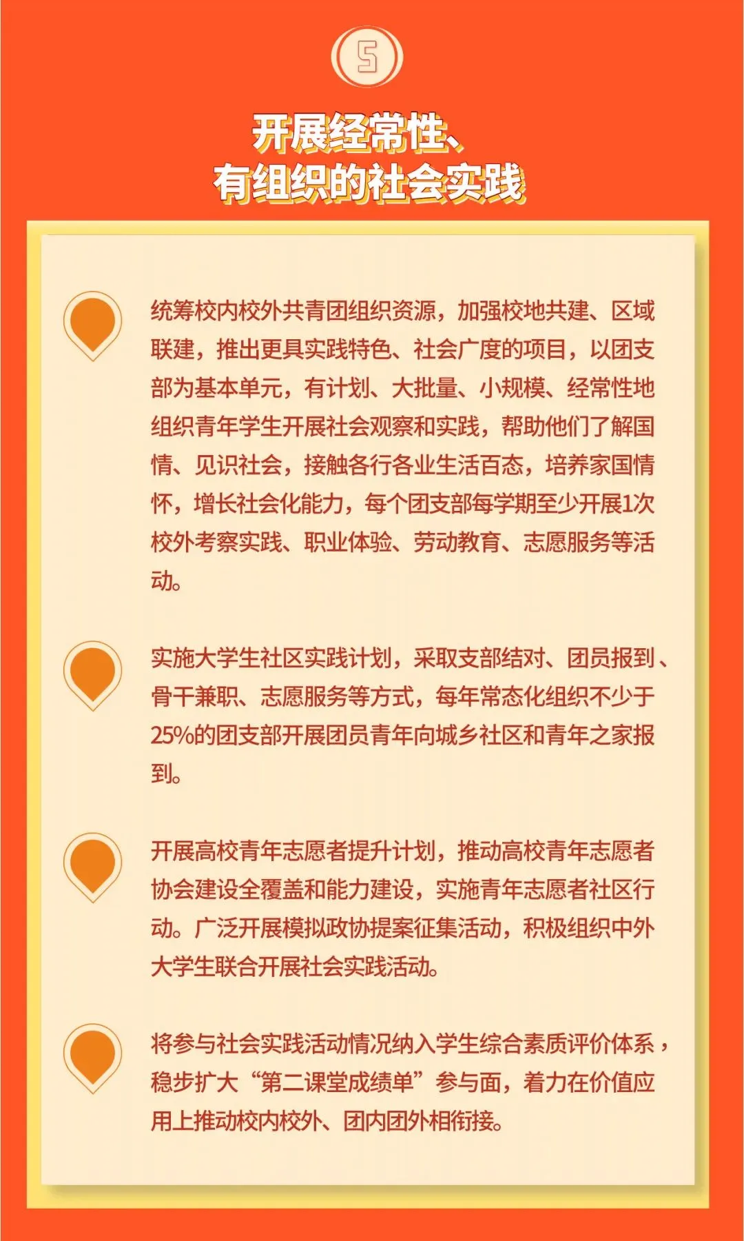 5. 开展经常性、有组织的社会实践。统筹校内校外共青团组织资源,加强校地共建、区域联建,推出更具实践特色、社会广度的项目,以团支部为基本单元,有计划、大批量、小规模、经常性地组织青年学生开展社会观察和实践,帮助他们了解国情、见识社会,接触各行各业生活百态,培养家国情怀,增长社会化能力,每个团支部每学期至少开展1次校外考察实践、职业体验、劳动教育、志愿服务等活动。实施大学生社区实践计划,采取支部结对、团员报到、骨干兼职、志愿服务等方式,每年常态化组织不少于25%的团支部开展团员青年向城乡社区和青年之家报到。开展高校青年志愿者提升计划,推动高校青年志愿者协会建设全覆盖和能力建设,实施青年志愿者社区行动。广泛开展模拟政协提案征集活动,积极组织中外大学生联合开展社会实践活动。将参与社会实践活动情况纳入学生综合素质评价体系,稳步扩大“第二课堂成绩单”参与面,着力在价值应用上推动校内校外、团内团外相衔接。