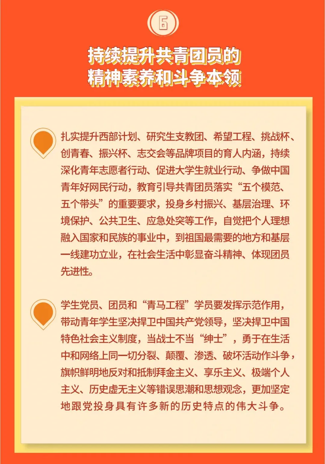 6. 持续提升共青团员的精神素养和斗争本领。扎实提升西部计划、研究生支教团、希望工程、挑战杯、创青春、振兴杯、志交会等品牌项目的育人内涵,持续深化青年志愿者行动、促进大学生就业行动、争做中国青年好网民行动,教育引导共青团员落实“五个模范、五个带头”的重要要求,投身乡村振兴、基层治理、环境保护、公共卫生、应急处突等工作,自觉把个人理想融入国家和民族的事业中,到祖国最需要的地方和基层一线建功立业,在社会生活中彰显奋斗精神、体现团员先进性。学生党员、团员和“青马工程”学员要发挥示范作用,带动青年学生坚决捍卫中国共产党领导,坚决捍卫中国特色社会主义制度,当战士不当“绅士”,勇于在生活中和网络上同一切分裂、颠覆、渗透、破坏活动作斗争,旗帜鲜明地反对和抵制拜金主义、享乐主义、极端个人主义、历史虚无主义等错误思潮和思想观念,更加坚定地跟党投身具有许多新的历史特点的伟大斗争。