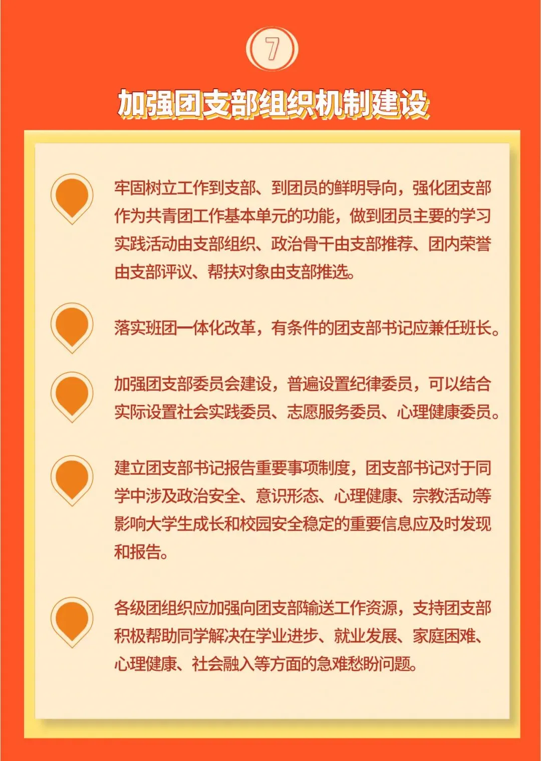 7. 加强团支部组织机制建设。牢固树立工作到支部、到团员的鲜明导向,强化团支部作为共青团工作基本单元的功能,做到团员主要的学习实践活动由支部组织、政治骨干由支部推荐、团内荣誉由支部评议、帮扶对象由支部推选。落实班团一体化改革,有条件的团支部书记应兼任班长。加强团支部委员会建设,普遍设置纪律委员,可以结合实际设置社会实践委员、志愿服务委员、心理健康委员。建立团支部书记报告重要事项制度,团支部书记对于同学中涉及政治安全、意识形态、心理健康、宗教活动等影响大学生成长和校园安全稳定的重要信息应及时发现和报告。各级团组织应加强向团支部输送工作资源,支持团支部积极帮助同学解决在学业进步、就业发展、家庭困难、心理健康、社会融入等方面的急难愁盼问题。